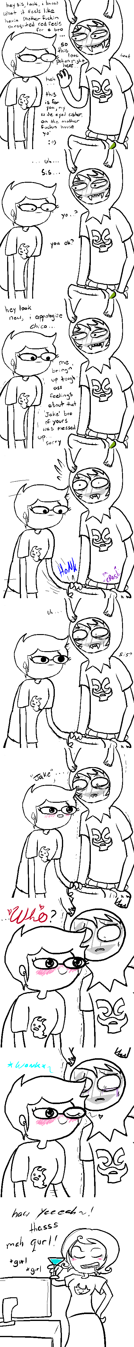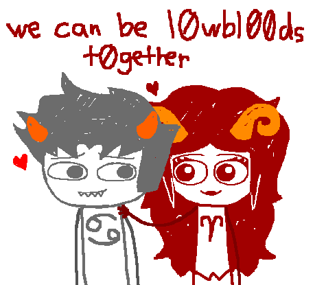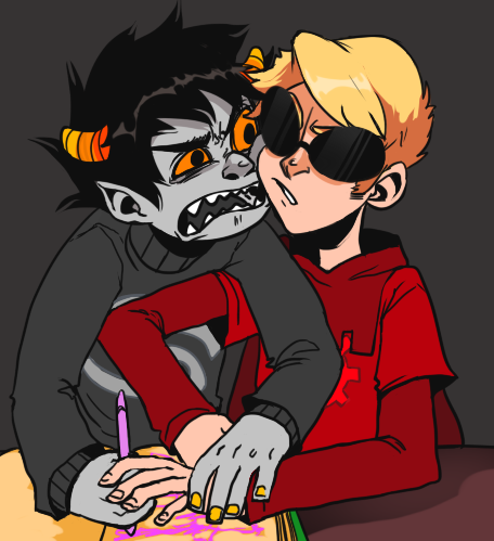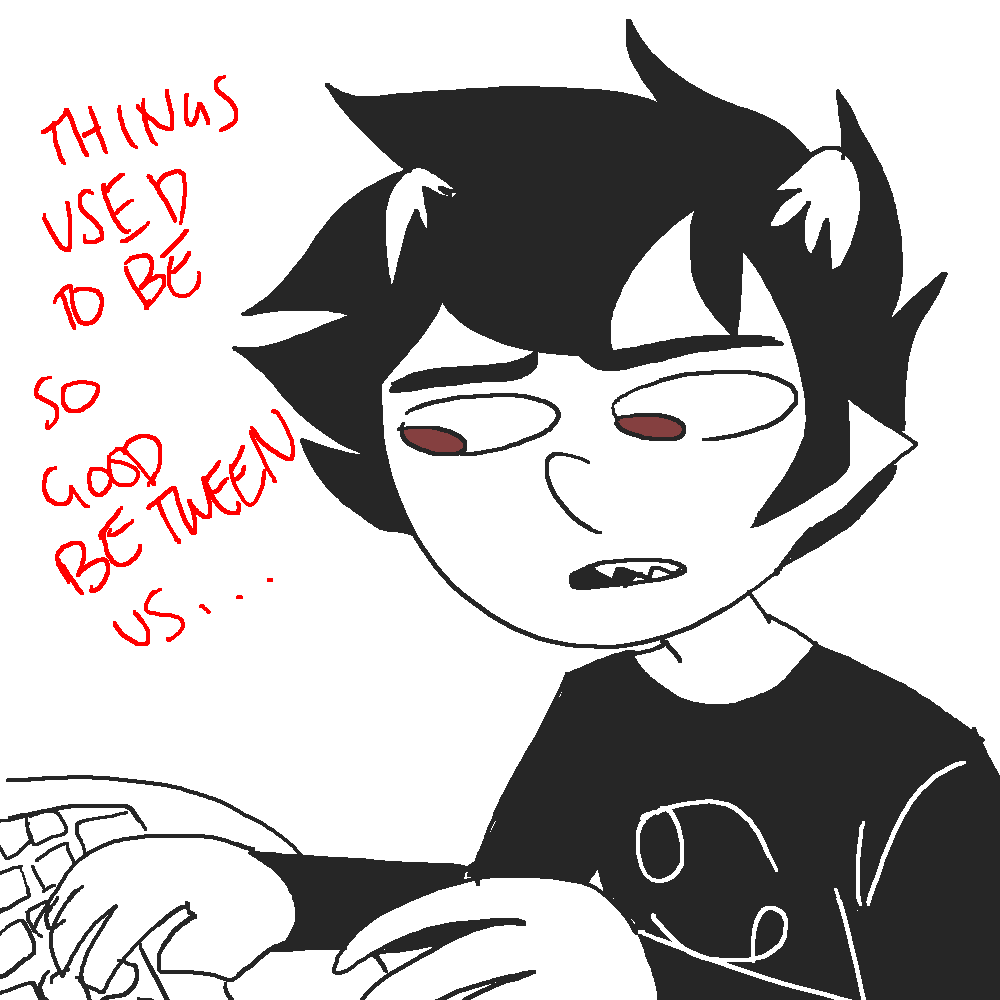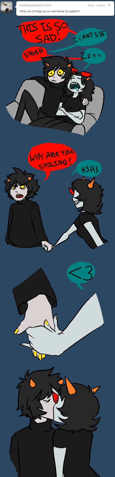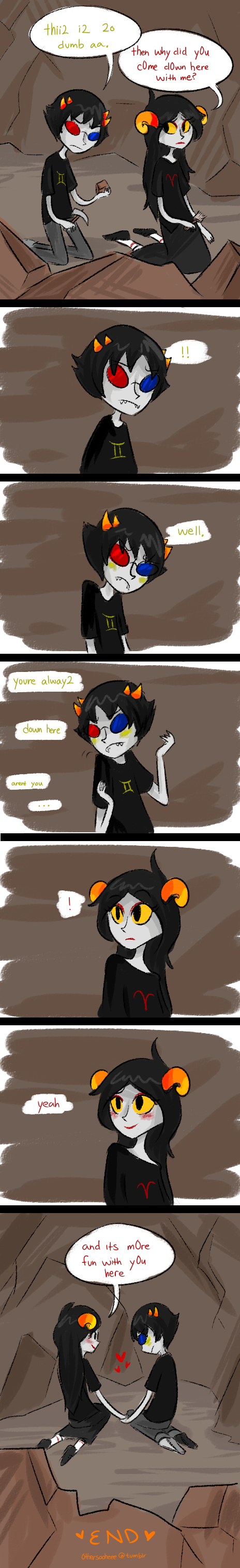 The reason why Karkat is getting so self-destructively retarded when it comes to Terezi is because he's having feelings of a 'beyond quadrent' nature for her like the Signless did for the Disciple and he can't make them mesh with his 'mastery' of the theory of troll romance, When he brought it up to himself in the timeloop convo he accused himself of being one of those pathetic joke characters in thier troll romcoms just because he wants to have a 'romantic' connection with one person, all of him and all of her, closer to the Human idea of 'true' love.