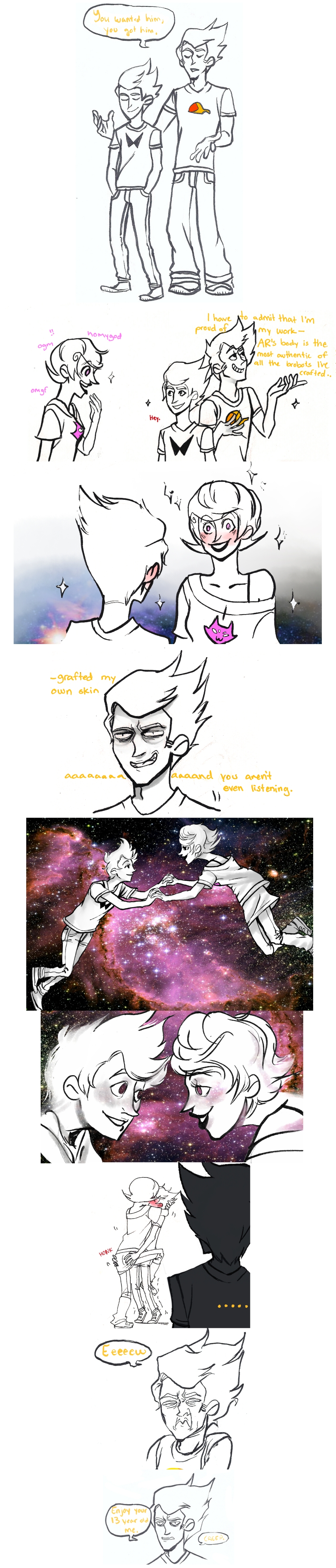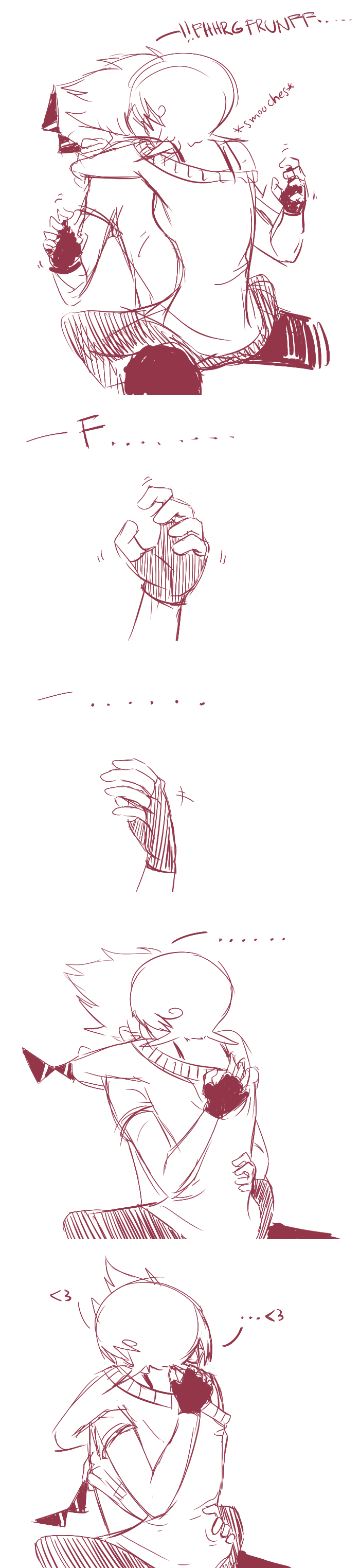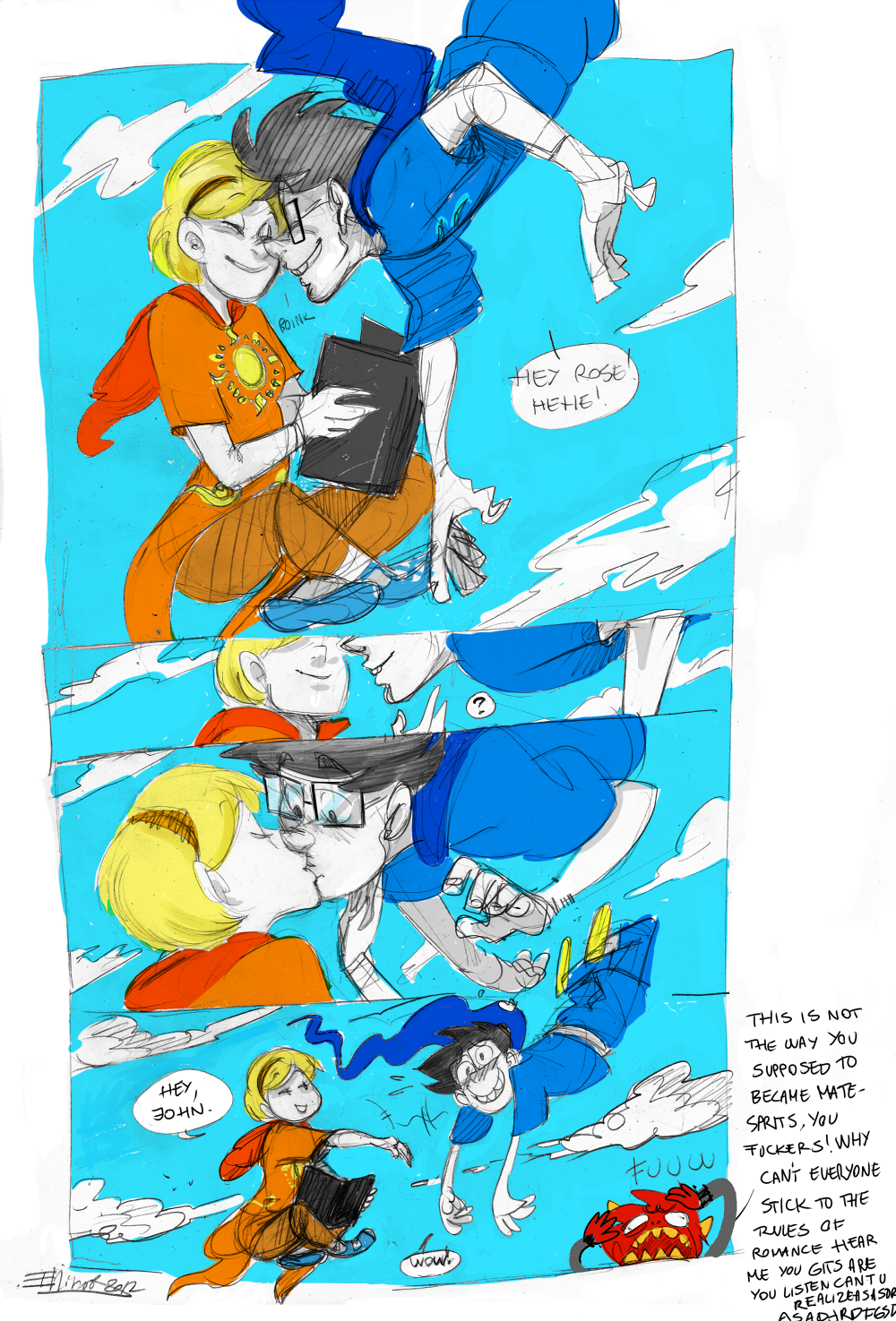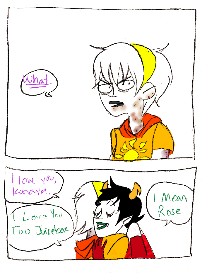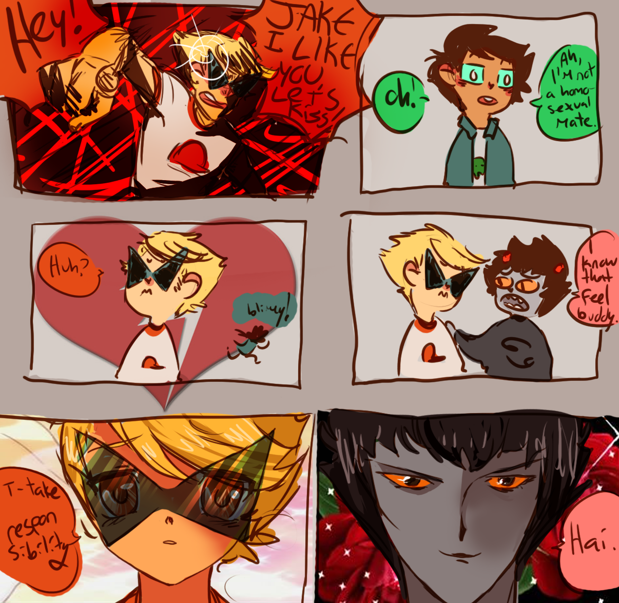The reason why Karkat is getting so self-destructively retarded when it comes to Terezi is because he's having feelings of a 'beyond quadrent' nature for her like the Signless did for the Disciple and he can't make them mesh with his 'mastery' of the theory of troll romance, When he brought it up to himself in the timeloop convo he accused himself of being one of those pathetic joke characters in thier troll romcoms just because he wants to have a 'romantic' connection with one person, all of him and all of her, closer to the Human idea of 'true' love.