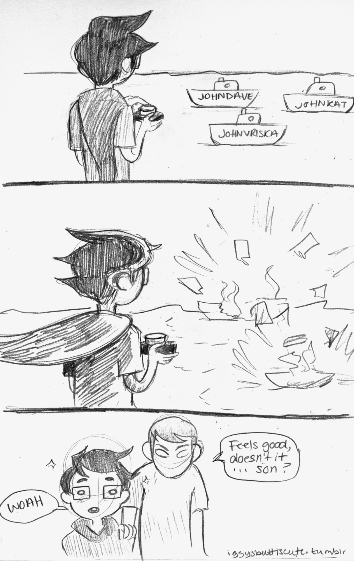 You know, from looking at various Homestuck livebloggings and such, a number of livebloggers have gotten the impression at some point or another that John is a bit sociopathic. What with him not even giving a second to stop and think about the fact that most of the human race is now dead and just going around like "Yay! Adventure!"