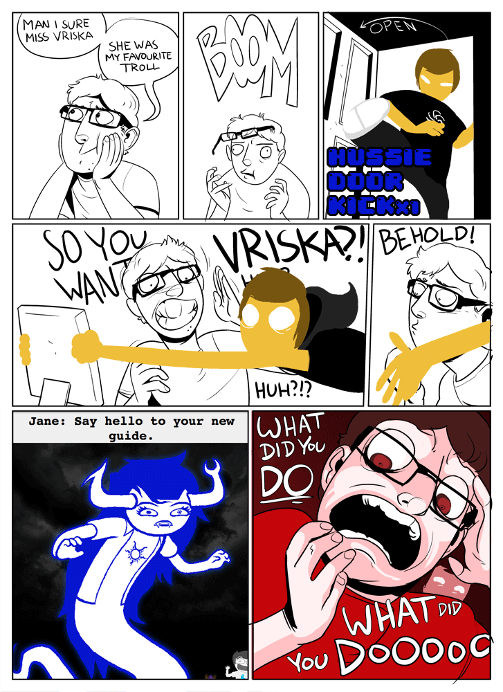 for instance: bec noir. at the time that vriska did all her work to make that shit take place, all they knew about "the demon" was that it was doggy and had wings and wore the green lightning, and that it showed up when they were about to open the door and sliced the door in half and roboaradia had to throw them all on a teleporter to escape.