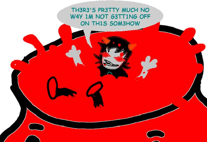 Another related issue is that he has more or less completed his arc, with the murder spree being the real climax of the thing, but he's stayed on in the cast anyway. (Vriska also kind of has this problem, where she has done her thing and died, ending her story and serving as a catalyst to further Terezi's, but she's still in the story for some reason as a static character who repeats her old grievances to Meenah.) I'd be more forgiving if he went berserk and then was shot down, which would make his entire character sort of pointless, but he wouldn't be an ongoing problem at least.