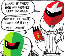 Bass chances upon a broken, destitute Light. He then demands that Thomas build him a companion, an equal, with which to fight the coldness of his existence ala Frankenstein (the Bride demand from the original story). (Gold and Blue)