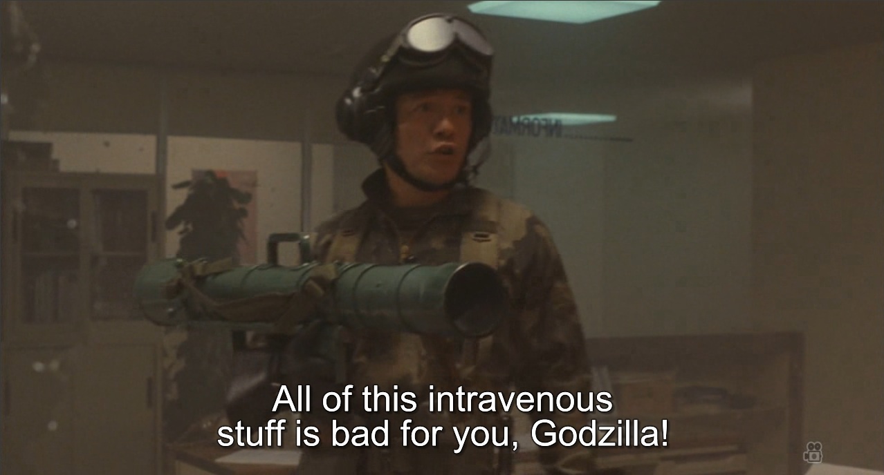 I could make an elaborate hypothesis about how Godzilla's representation of the US didn't end with the first movie. I could say that as the battle lines of the Cold War were being drawn, Godzilla found himself playing the part of the hero against communist space dragons and Soviet engineering made to counter him. I could say that as those looming threads died in the real world, Godzilla once took on an unsure, and percieved unstable role in modern society. But honestly, it would sound like I'm reading too much into a movie about karate dinosaurs.