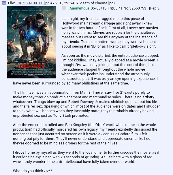 >>37035 Alright lets counter point this fuck! *cracks fingers piano style* 1) Good point! Igor/Hulkbuster should have been bust out of that. But I guess fucking rubble blocks the signal or more likely they did not want to tip their hand to early, even if they put it in the trailer. 2) Man, I am trying my hardest not to point out how you sound like my mom. She has a MASSIVE hateboner for that shit. I dont mind. Just look around yourselfs, tons for products, thats just our world. Thats why I dont like it when movie set in "our world" dont lets say uses a real video game and instead fake one with cgi. I takes me out, do to nerdness. 3) Again good point, is that not what the fucking visor is for? 4) WAR ECONOMY! And you get alot of money when you sell both sides and the more powerfull one being okay with that do togiving his dauther a new leg, loved that shot. But then like alot off super villains he lost his shit when thing did not go as planed. 5) Because pepole got mad at the Hobbit for being to long so they cut out ALOT of stuff may?(fells like that to me) Stuff that would fix some of your issues. But no, cant have a 3 hour plus movie now can we? Hope they make LotR style extra all version. But that is no excuses for that ending. No more Burning Pepper? Fuck that, we need more female hero in this, hell we need more female MAIN villains but no, bang, gone, moving on. BAH. And if the rumors are true, then I am calling that Tony will be the Agent Coulson of Avangers 2.