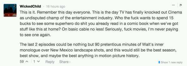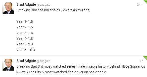 Just broke all the bads. I was looking forward to Walter being the one to tell Flynn about his drug problem and seeing Flynn explode, how he actually found out was underwhelming. Although, that confrontation between White, Skylar, and Flynn was fucking insane.