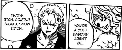 Now, what I don't understand is what was the point of all that. Is it to show that Zoro's not sexist? Huh? Why spend an entire chapter on that? Is it just a battle chapter and the whole point was to show some neat fighting and moves, and to have Monet be defeated? Well, that's fair, if a little weak. Is it to have Tashigi stop being so willfully ignorant and maybe motivate her to not be worthless, eventually? I think we can all agree this would be the best case scenario, but I don't really buy it. As far as first steps go this one is pretty alright. It's just that, Tashigi has gotten scenes like this before and she always gets to where she is now i.e. too useless to help but too useful to die. The whole thing is weird.