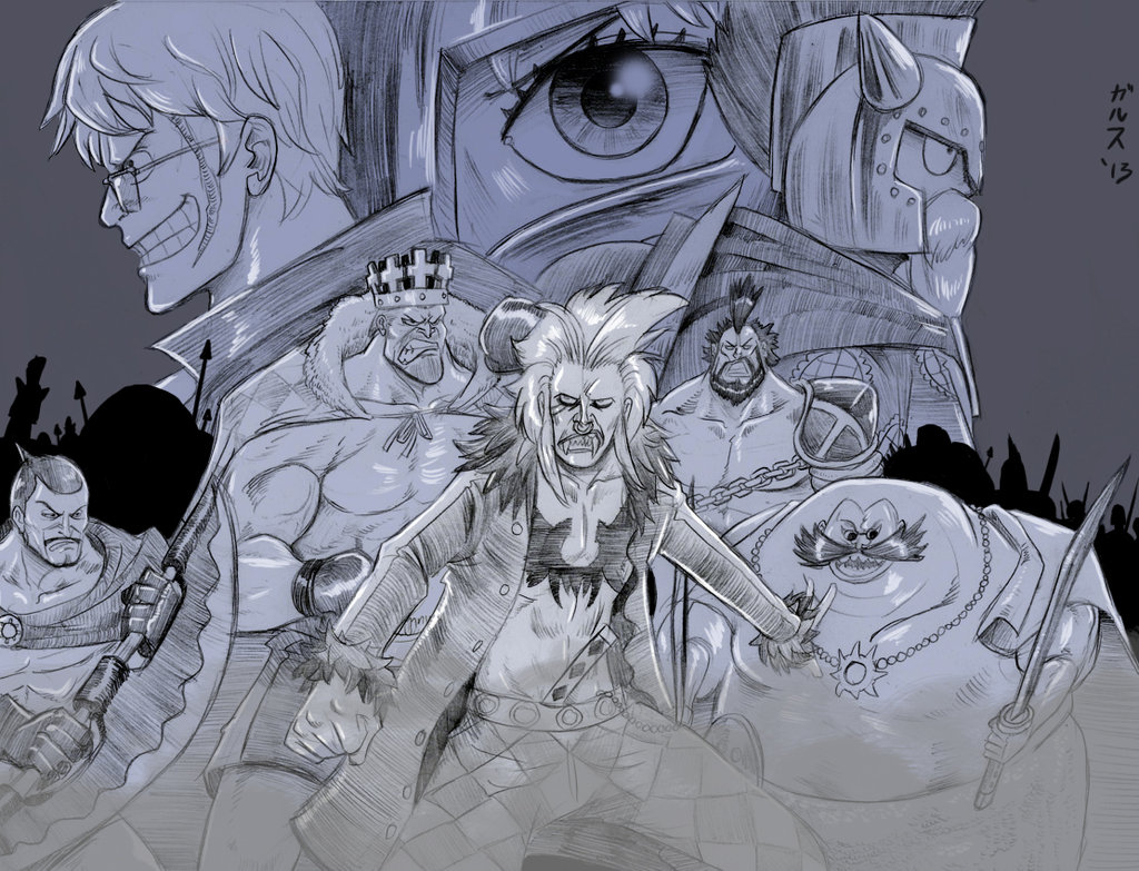 the likelihood of all of these dudes showing up for some inevitable battle royale thing toward the end of the arc is somewhere around 10000%. plus i think this is just oda having fun drawing tons of weird looking muscle-dudes.