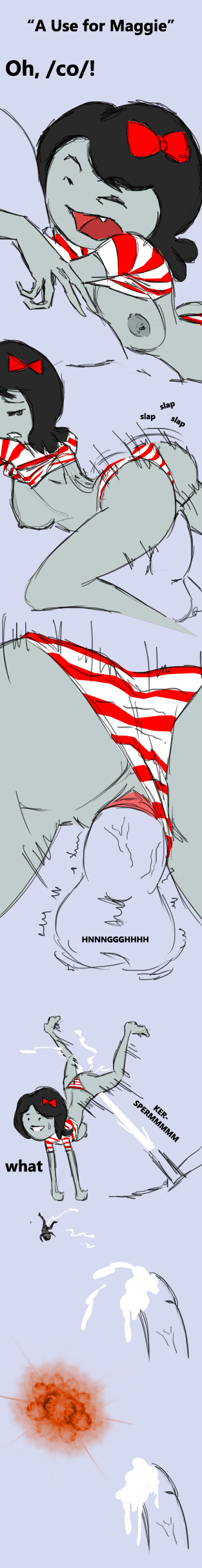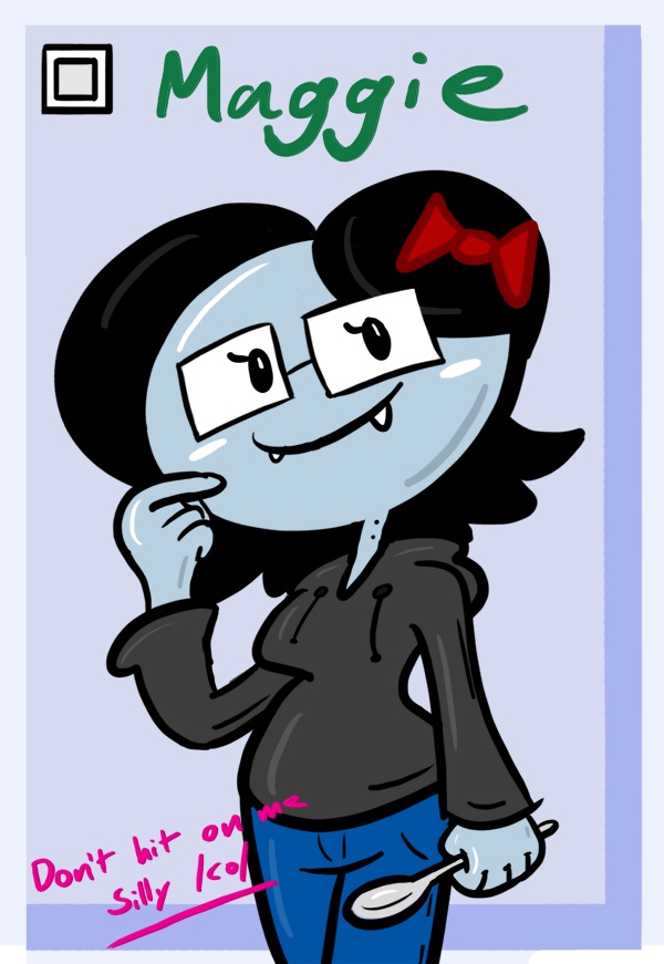 >>135734When Adventure Time was just starting out and they introduced Marceline, someone commented on how she looked like a spoon. From there a drawfag started doing pics of Maggie the Vampire Spoon and other drawfags jumped in.It went downhill fast when she started getting spammed in AT threads and started getting threads to herself. She was a flavor of the month but some felt she was a flavor of the year(s).Those were dark times.