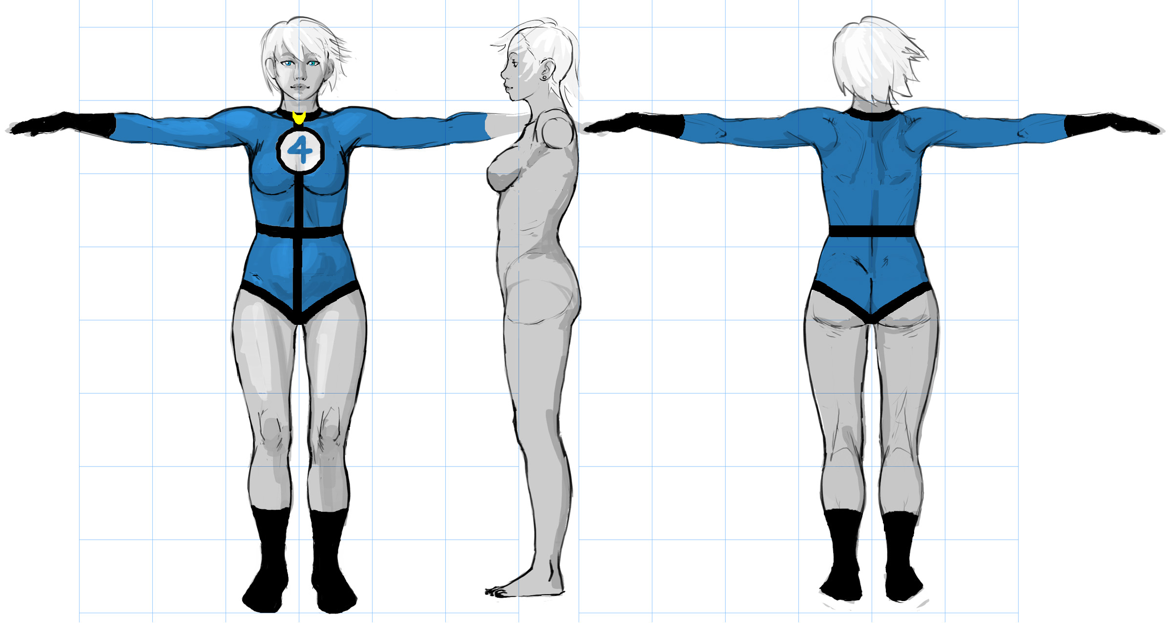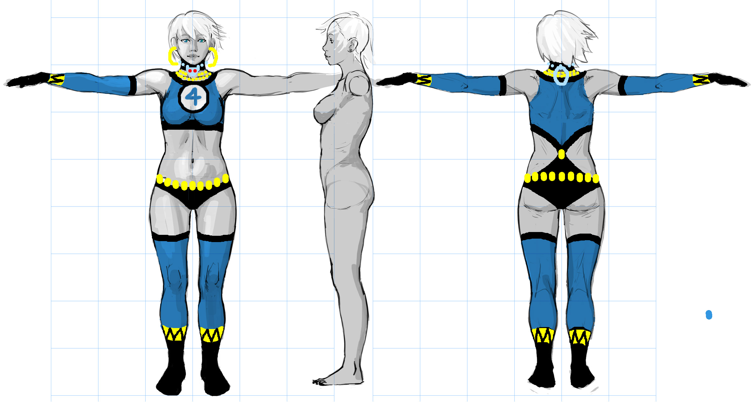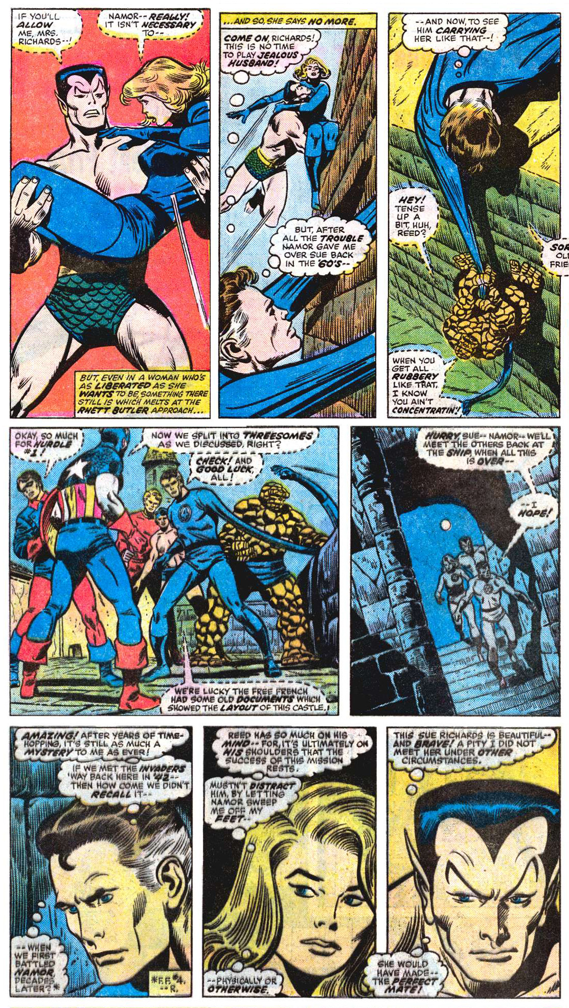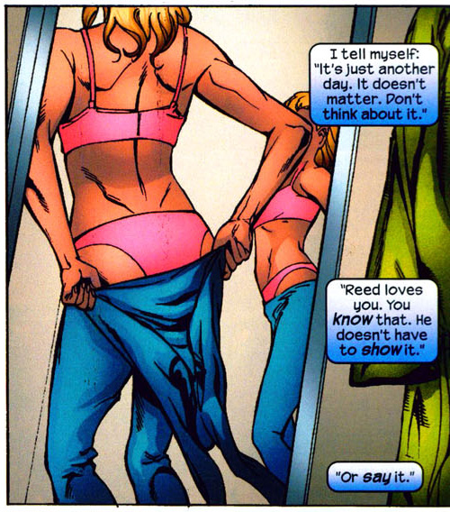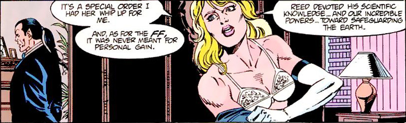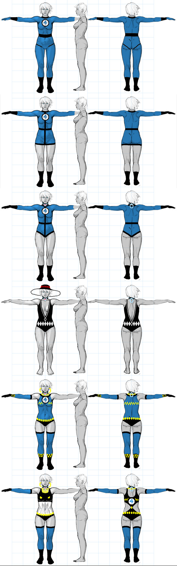 So, well, how could the Namor storyline be handled in our universe? First of all, I’d suggest to keep the main timeline and plot points of the story as much as possible. As in the original, Sue and Reed separate, Reed shoots Franklin, Sue starts hating him even more, etc. But there would be some changes. What could they be? Firstly, Sue would fall into BP’s arms as soon as she separates with Reed. But as she’s still Reed’s wife (and she doesn’t hate Reed at that point), she decides to still keep their affair secret. Though they meet quite often, and maybe some fun scenes may be had where both of them try to hide their affair from the Avengers. Later, BP may visit her in Pennsylvania (imagining BP donning a corny 70s-style cowboy costume is funny). After Reed shoots Franklin, Sue starts to hate him. In the original, this results in her going to Namor and deciding to divorce Reed and marry him, which turned out to be a plot by Namor to bring Reed and Sue back. In our universe, Sue will go to BP. Will she marry him? I think as in our universe she’s more confident and knows BP is attracted to her, she doesn’t need to rush things. She may have marriage on her mind, but maybe she first wants to see how things will work out with BP as a full-time partner instead of just a lover. But as she is still married to Reed, she’ll want to still keep their relationship secret. The solution? From January to August 1974 Sue will become BP’s superhero partner! With a new, BP-styled but not FF-styled costume, of course. Everyone will gossip and try to guess, do they or don’t they? Are they friends or lovers? They appear together, may hug or hold each other etc., but give no definite answer if they’re lovers or friends. This may make Reed angry, but not as angry as Namor’s blatant boasts in the original universe. But how will it end then? Why won’t Sue just leave Reed for BP altogether? Well, BP may have started falling for Sue. He now would like Sue to choose him permanently, for a serious relationship. But he wants her to first come to terms about her feelings about Reed. And, as much as she hates Reed, some part of her still misses and loves him (shown in the original comic), and BP sees this. He also isn’t sure, if what Sue feels is just sexual attraction, if he’s just a hunk with a big cock to her, a welcome sexual change from her husband and nothing more? So he decides to get them back, to give Reed and Sue another chance. Maybe he does something similar that Namor did, or something different. And leaves for Wakanda, leaving Sue to think about her feelings. Okay, it’s not only drama-drama-drama. I think the drama angle may be explored lightly, just as a background. The Sue-BP partnership may have some fun and sexy moments. The new costume, the fun moments of hiding their relationship from the public, the intimate moments of living together. And the hot sex. This may be the time when Sue, as an act of defiance to Reed, lets BP take her anal virginity – something she has never let Reed do (and never intends to). Thus, the “first anal” costume comes into play. Both the “partner” and the “first anal” costumes should accentuate her ass, I think.