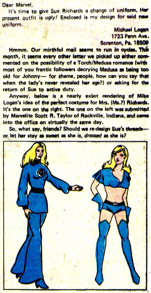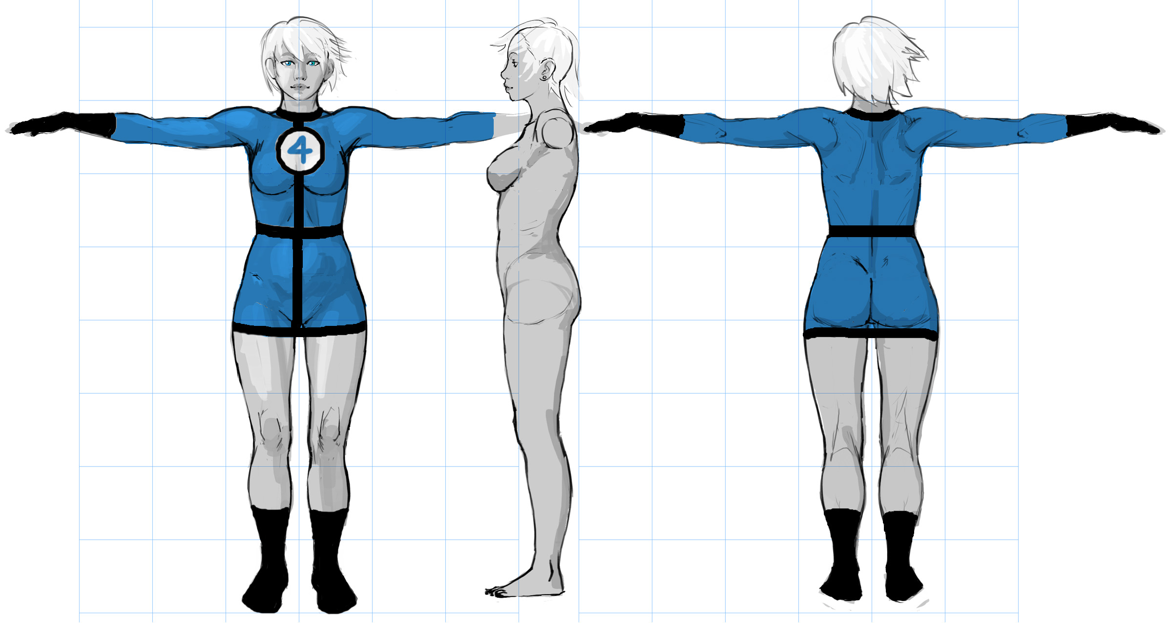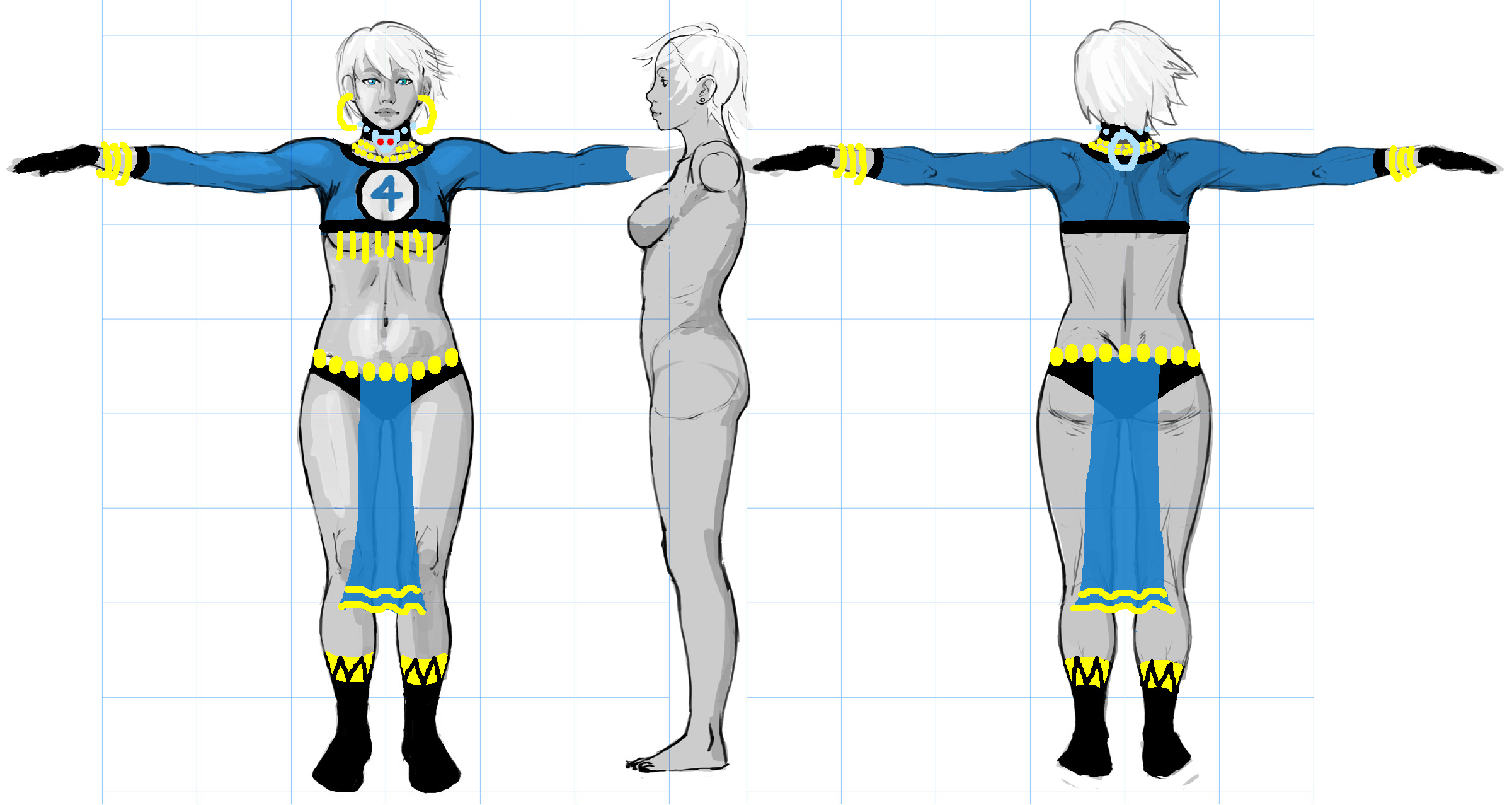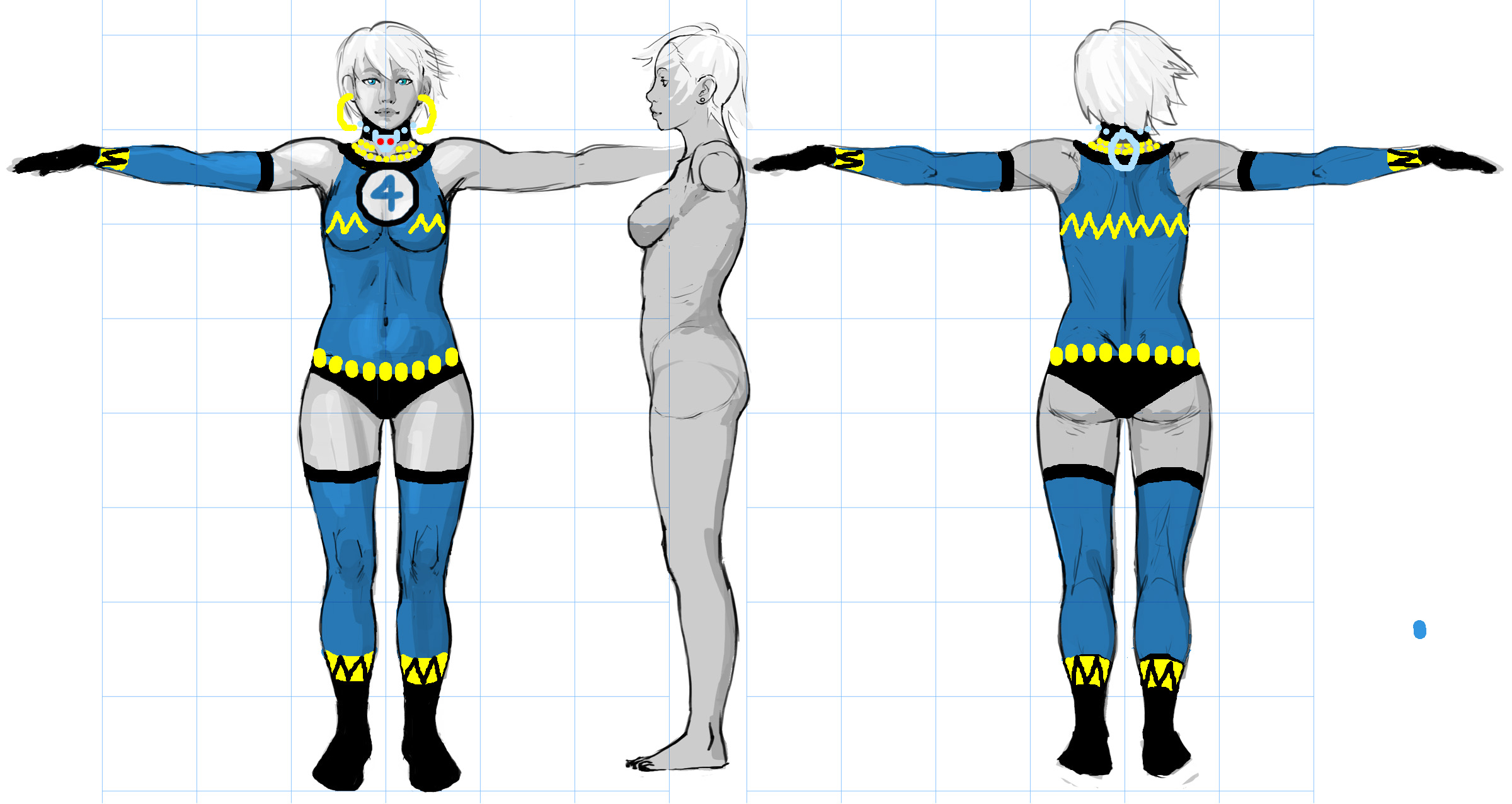 So, well, how could the Namor storyline be handled in our universe? First of all, I’d suggest to keep the main timeline and plot points of the story as much as possible. As in the original, Sue and Reed separate, Reed shoots Franklin, Sue starts hating him even more, etc. But there would be some changes. What could they be? Firstly, Sue would fall into BP’s arms as soon as she separates with Reed. But as she’s still Reed’s wife (and she doesn’t hate Reed at that point), she decides to still keep their affair secret. Though they meet quite often, and maybe some fun scenes may be had where both of them try to hide their affair from the Avengers. Later, BP may visit her in Pennsylvania (imagining BP donning a corny 70s-style cowboy costume is funny). After Reed shoots Franklin, Sue starts to hate him. In the original, this results in her going to Namor and deciding to divorce Reed and marry him, which turned out to be a plot by Namor to bring Reed and Sue back. In our universe, Sue will go to BP. Will she marry him? I think as in our universe she’s more confident and knows BP is attracted to her, she doesn’t need to rush things. She may have marriage on her mind, but maybe she first wants to see how things will work out with BP as a full-time partner instead of just a lover. But as she is still married to Reed, she’ll want to still keep their relationship secret. The solution? From January to August 1974 Sue will become BP’s superhero partner! With a new, BP-styled but not FF-styled costume, of course. Everyone will gossip and try to guess, do they or don’t they? Are they friends or lovers? They appear together, may hug or hold each other etc., but give no definite answer if they’re lovers or friends. This may make Reed angry, but not as angry as Namor’s blatant boasts in the original universe. But how will it end then? Why won’t Sue just leave Reed for BP altogether? Well, BP may have started falling for Sue. He now would like Sue to choose him permanently, for a serious relationship. But he wants her to first come to terms about her feelings about Reed. And, as much as she hates Reed, some part of her still misses and loves him (shown in the original comic), and BP sees this. He also isn’t sure, if what Sue feels is just sexual attraction, if he’s just a hunk with a big cock to her, a welcome sexual change from her husband and nothing more? So he decides to get them back, to give Reed and Sue another chance. Maybe he does something similar that Namor did, or something different. And leaves for Wakanda, leaving Sue to think about her feelings. Okay, it’s not only drama-drama-drama. I think the drama angle may be explored lightly, just as a background. The Sue-BP partnership may have some fun and sexy moments. The new costume, the fun moments of hiding their relationship from the public, the intimate moments of living together. And the hot sex. This may be the time when Sue, as an act of defiance to Reed, lets BP take her anal virginity – something she has never let Reed do (and never intends to). Thus, the “first anal” costume comes into play. Both the “partner” and the “first anal” costumes should accentuate her ass, I think.
