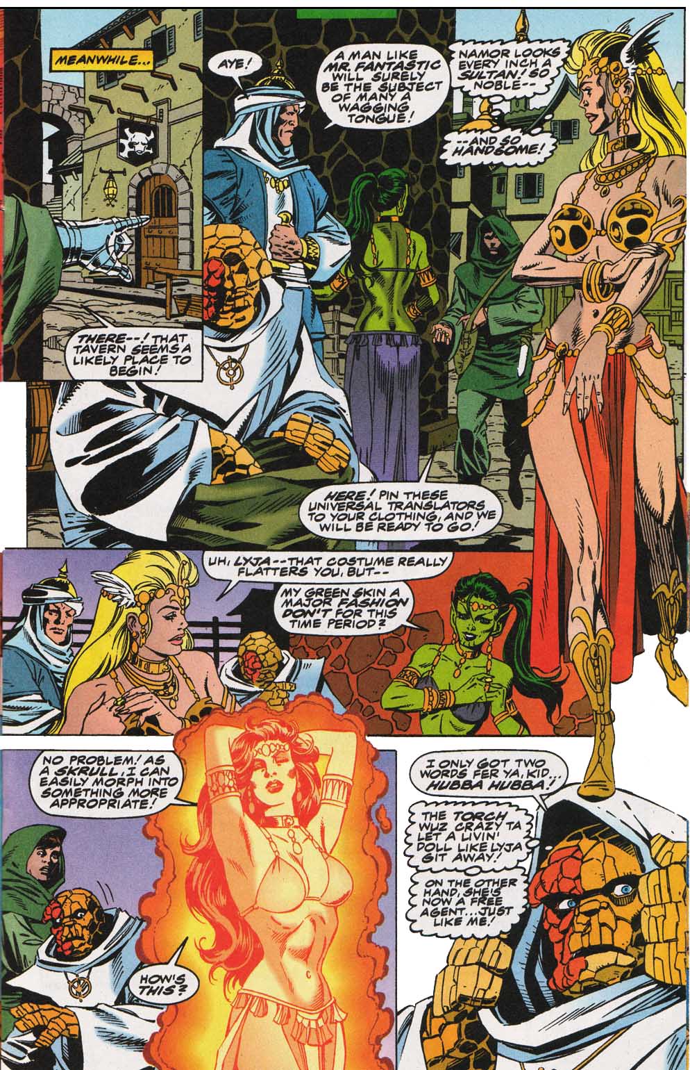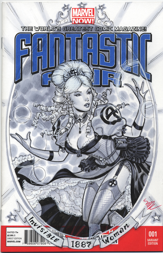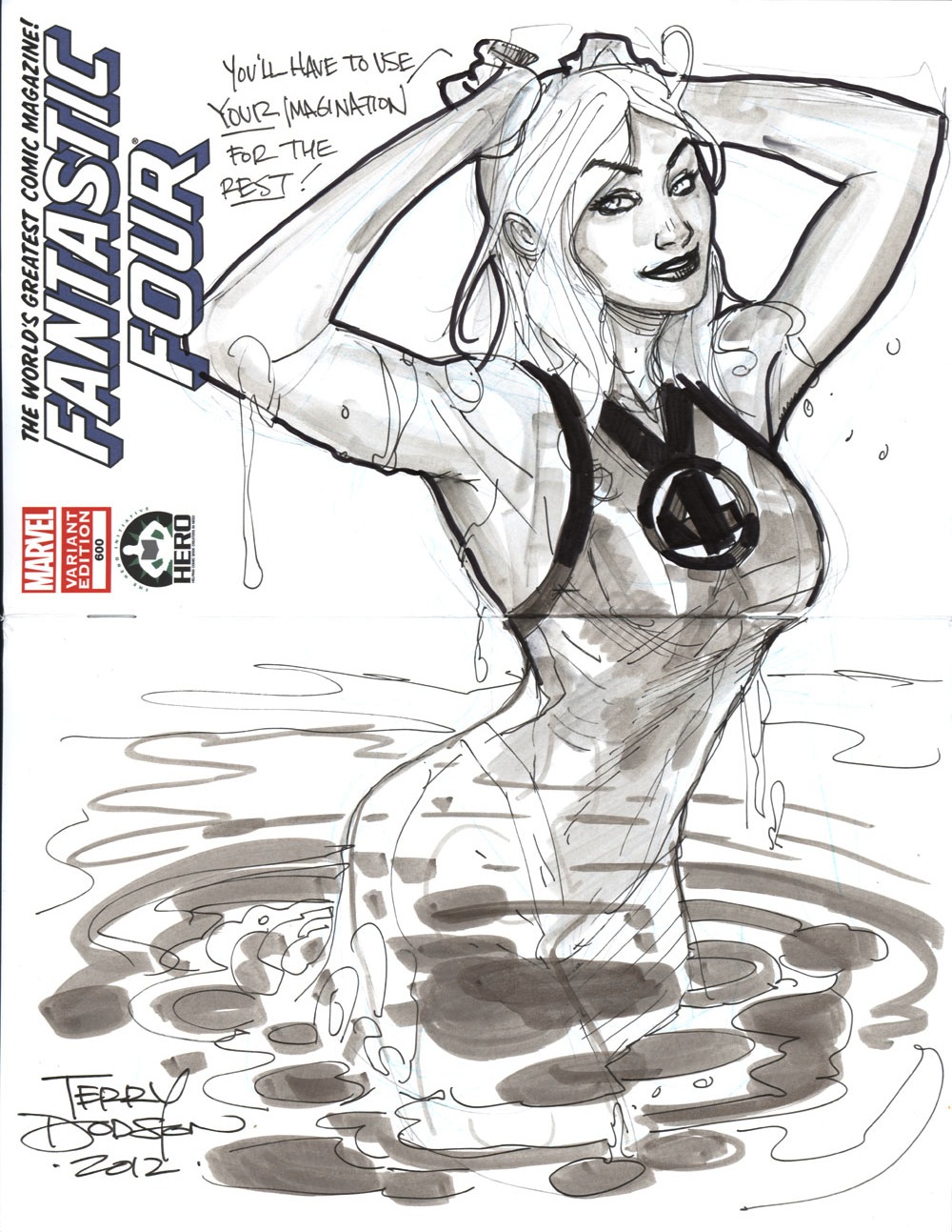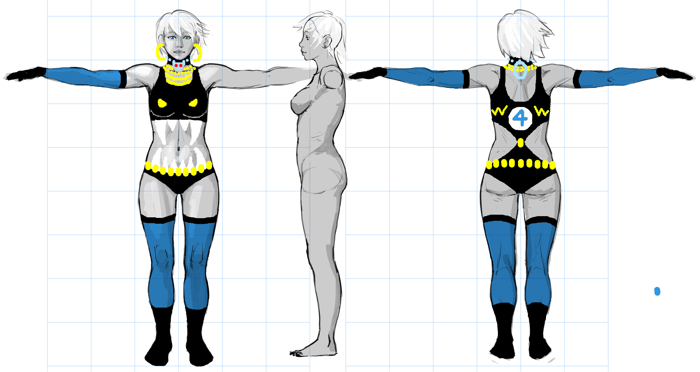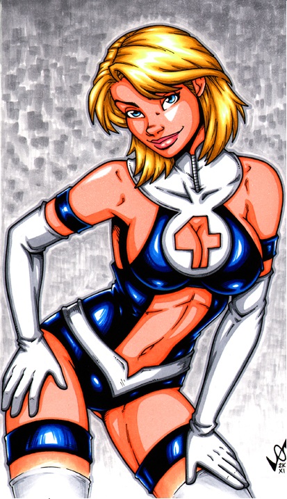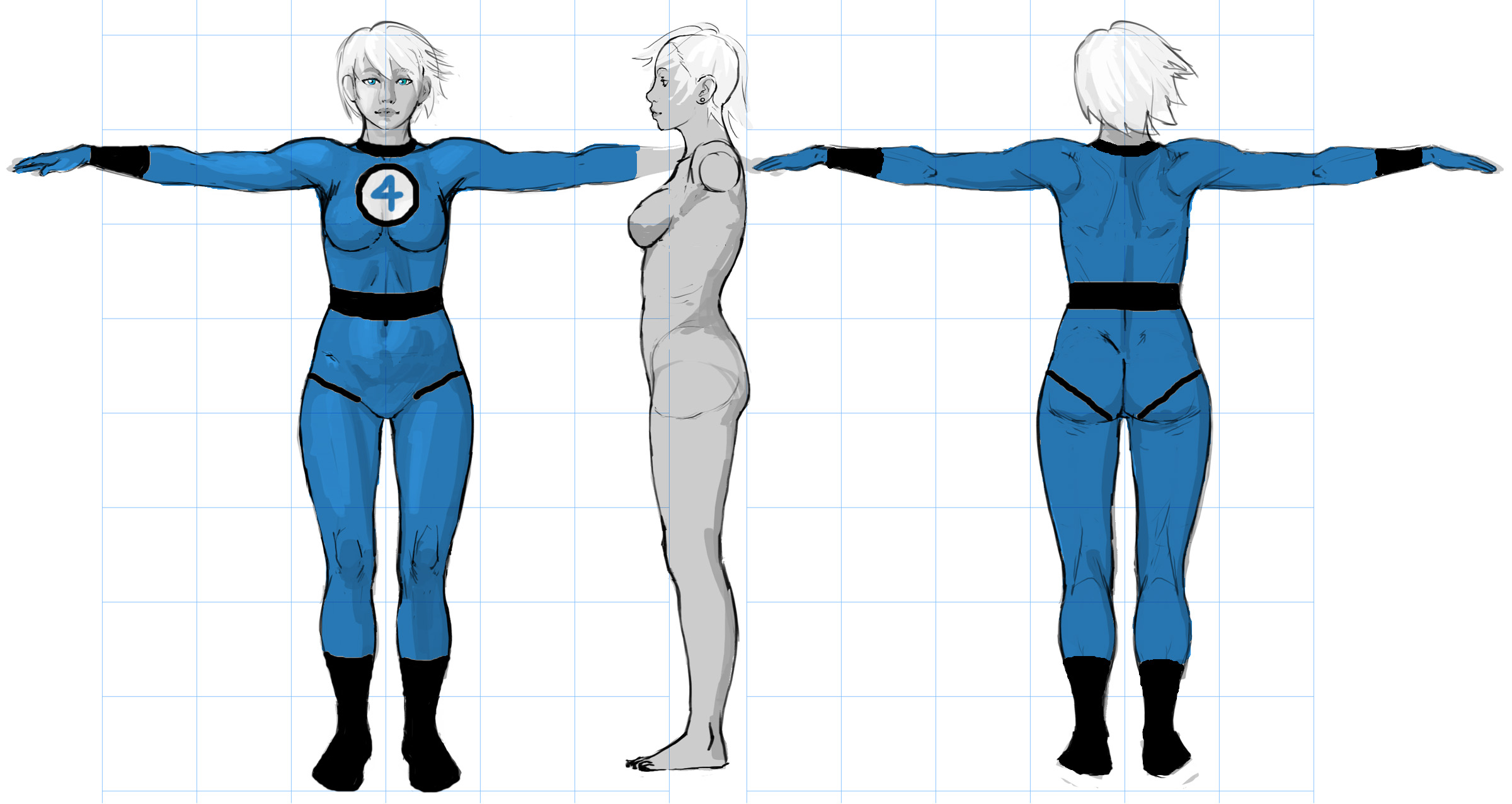 So, well, how could the Namor storyline be handled in our universe? First of all, I’d suggest to keep the main timeline and plot points of the story as much as possible. As in the original, Sue and Reed separate, Reed shoots Franklin, Sue starts hating him even more, etc. But there would be some changes. What could they be? Firstly, Sue would fall into BP’s arms as soon as she separates with Reed. But as she’s still Reed’s wife (and she doesn’t hate Reed at that point), she decides to still keep their affair secret. Though they meet quite often, and maybe some fun scenes may be had where both of them try to hide their affair from the Avengers. Later, BP may visit her in Pennsylvania (imagining BP donning a corny 70s-style cowboy costume is funny). After Reed shoots Franklin, Sue starts to hate him. In the original, this results in her going to Namor and deciding to divorce Reed and marry him, which turned out to be a plot by Namor to bring Reed and Sue back. In our universe, Sue will go to BP. Will she marry him? I think as in our universe she’s more confident and knows BP is attracted to her, she doesn’t need to rush things. She may have marriage on her mind, but maybe she first wants to see how things will work out with BP as a full-time partner instead of just a lover. But as she is still married to Reed, she’ll want to still keep their relationship secret. The solution? From January to August 1974 Sue will become BP’s superhero partner! With a new, BP-styled but not FF-styled costume, of course. Everyone will gossip and try to guess, do they or don’t they? Are they friends or lovers? They appear together, may hug or hold each other etc., but give no definite answer if they’re lovers or friends. This may make Reed angry, but not as angry as Namor’s blatant boasts in the original universe. But how will it end then? Why won’t Sue just leave Reed for BP altogether? Well, BP may have started falling for Sue. He now would like Sue to choose him permanently, for a serious relationship. But he wants her to first come to terms about her feelings about Reed. And, as much as she hates Reed, some part of her still misses and loves him (shown in the original comic), and BP sees this. He also isn’t sure, if what Sue feels is just sexual attraction, if he’s just a hunk with a big cock to her, a welcome sexual change from her husband and nothing more? So he decides to get them back, to give Reed and Sue another chance. Maybe he does something similar that Namor did, or something different. And leaves for Wakanda, leaving Sue to think about her feelings. Okay, it’s not only drama-drama-drama. I think the drama angle may be explored lightly, just as a background. The Sue-BP partnership may have some fun and sexy moments. The new costume, the fun moments of hiding their relationship from the public, the intimate moments of living together. And the hot sex. This may be the time when Sue, as an act of defiance to Reed, lets BP take her anal virginity – something she has never let Reed do (and never intends to). Thus, the “first anal” costume comes into play. Both the “partner” and the “first anal” costumes should accentuate her ass, I think.