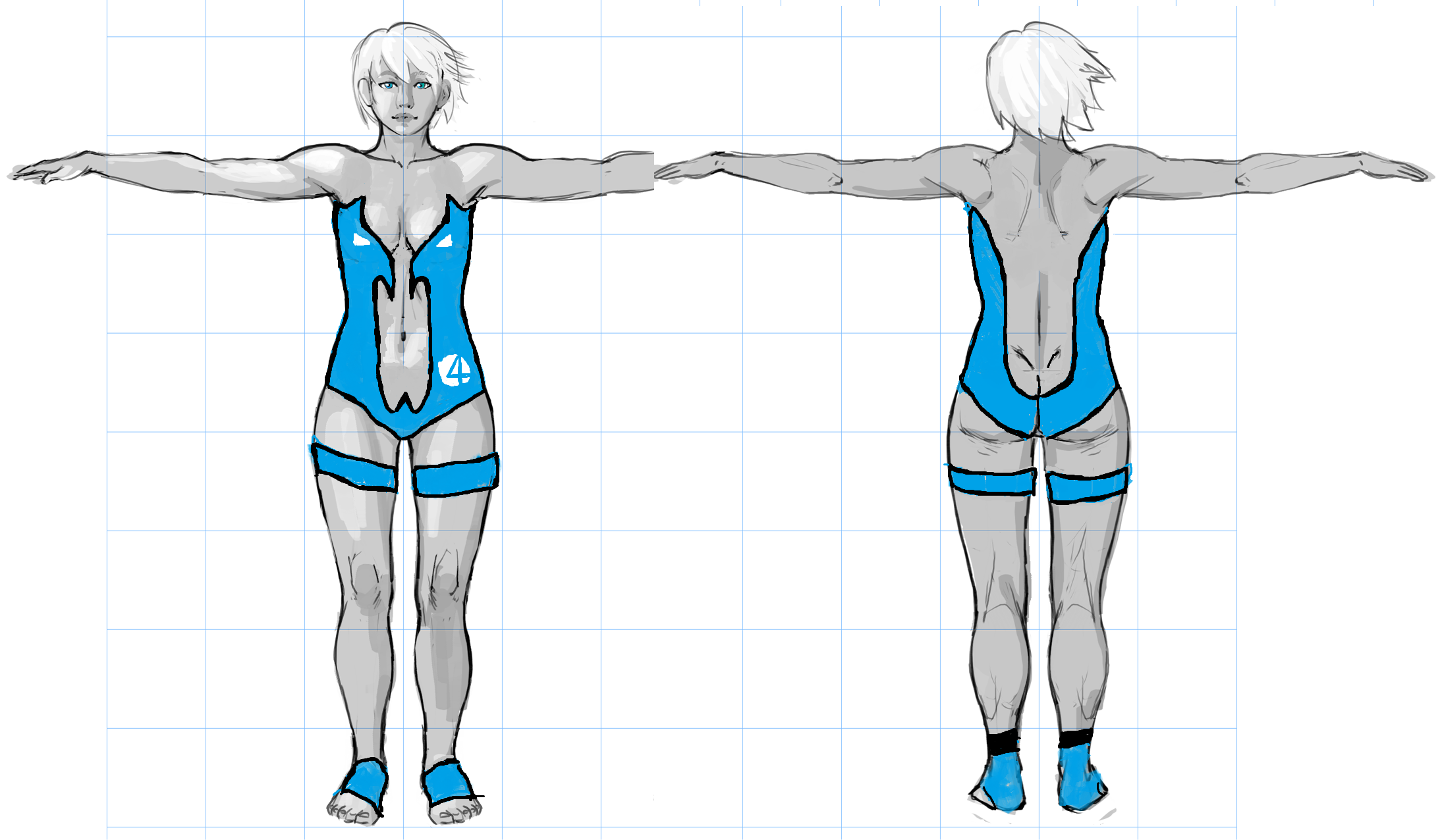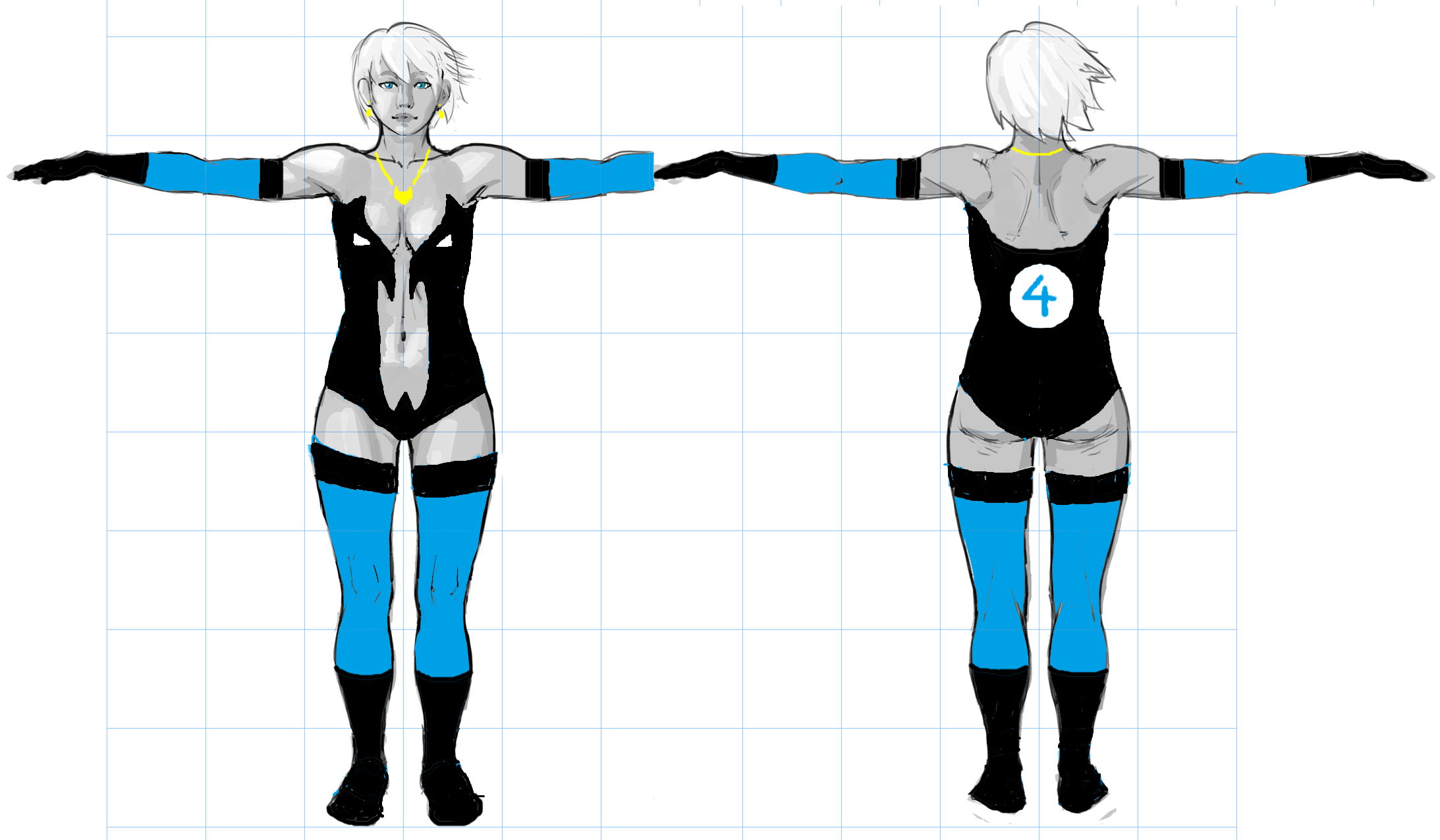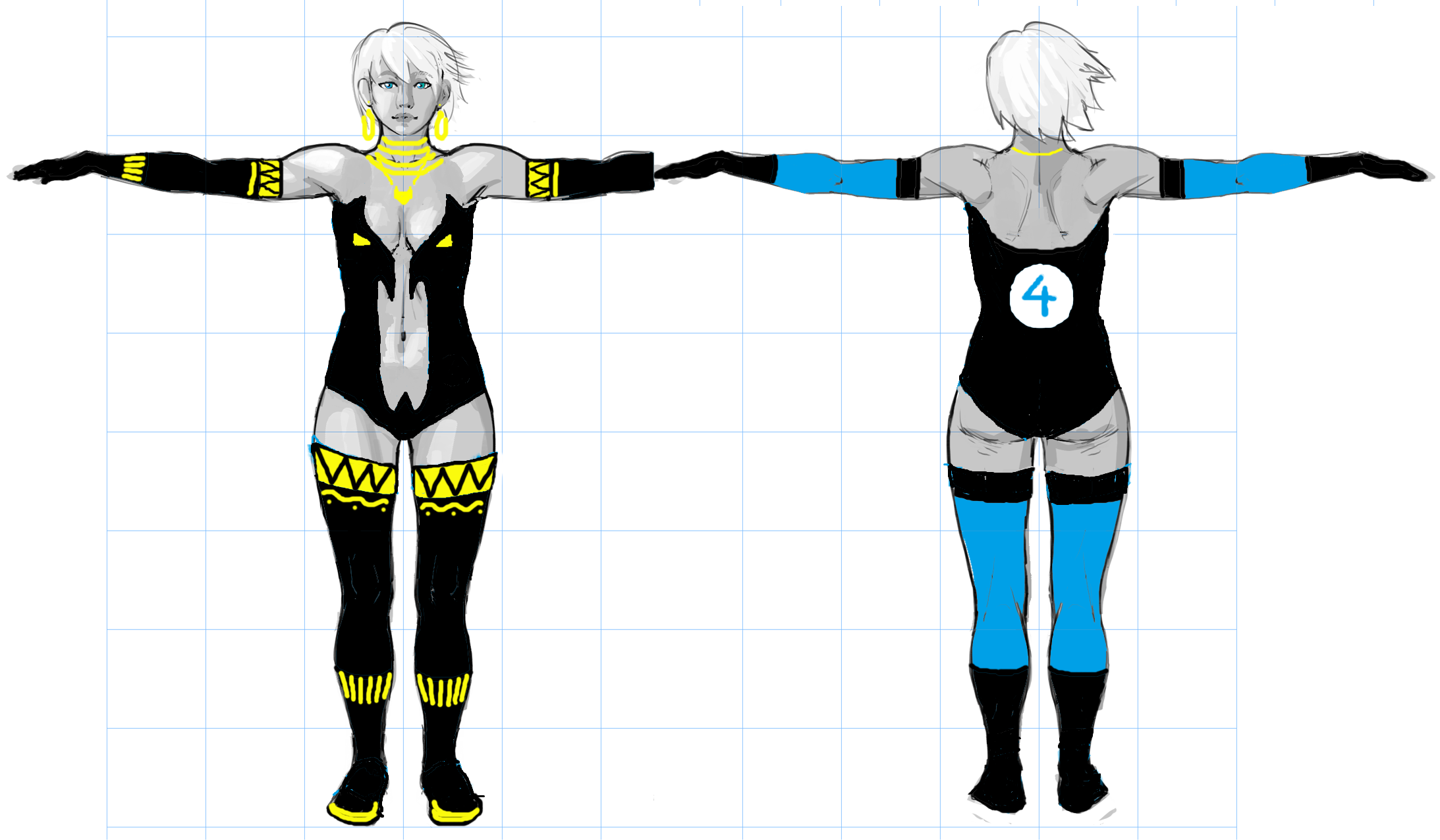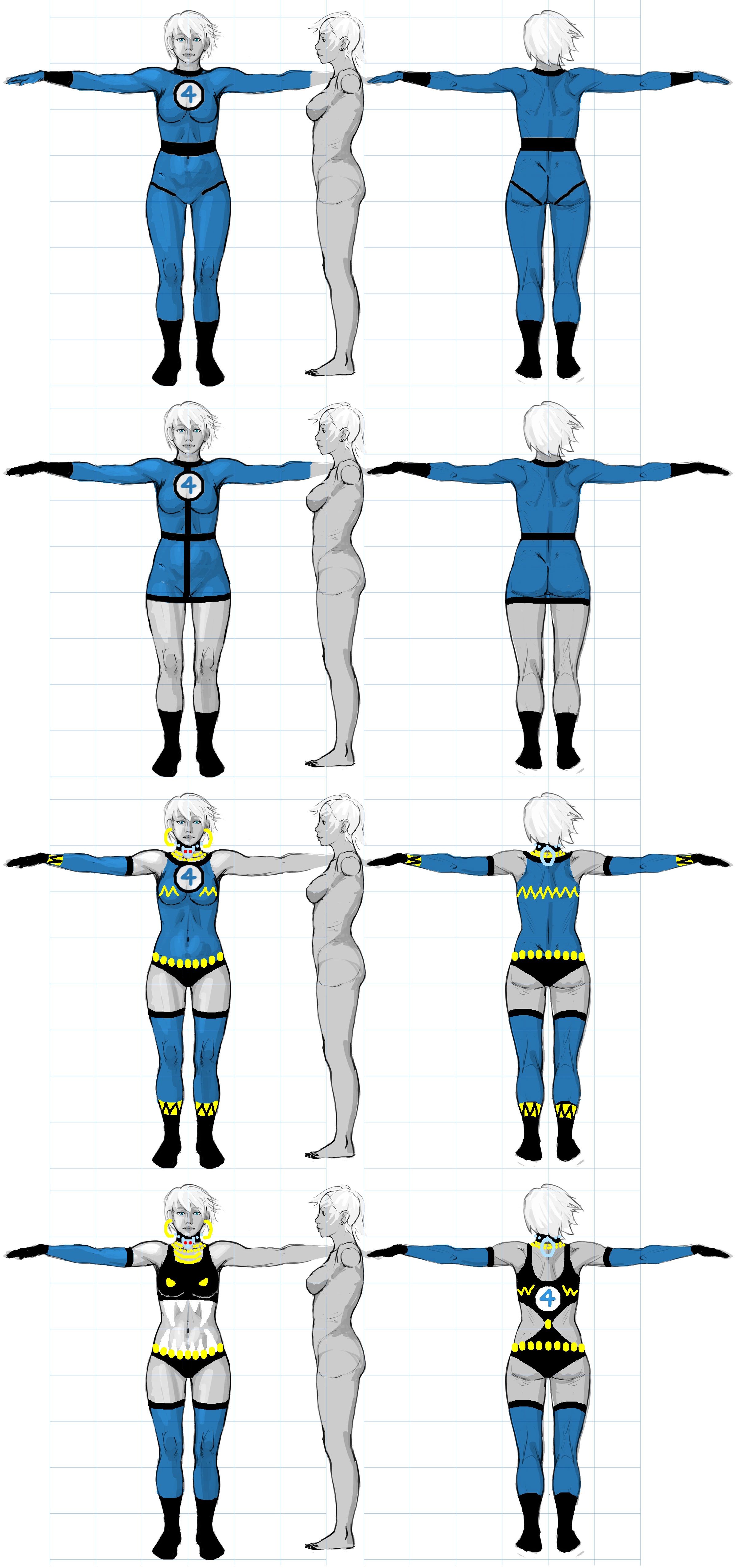 BP-themed FF suit v2.0. Now it's BP-themed, not just Wakanda-themed. It's based on v1.0, but has more black parts, and the middle resembles a panther head with an open maw. In the timeline I suggested, Sue created it to greet BP who was absent for several months. Sue missed sex with BP so much, she just didn't care what would others think, and created this blatantly BP-themed FF suit redesign. She wore it for only 2 months, but BP's reaction and sex still made it worth it. Note the FF emblem being relegated to the back while the panther maw is at the front, as a sign of Sue's brazenness.