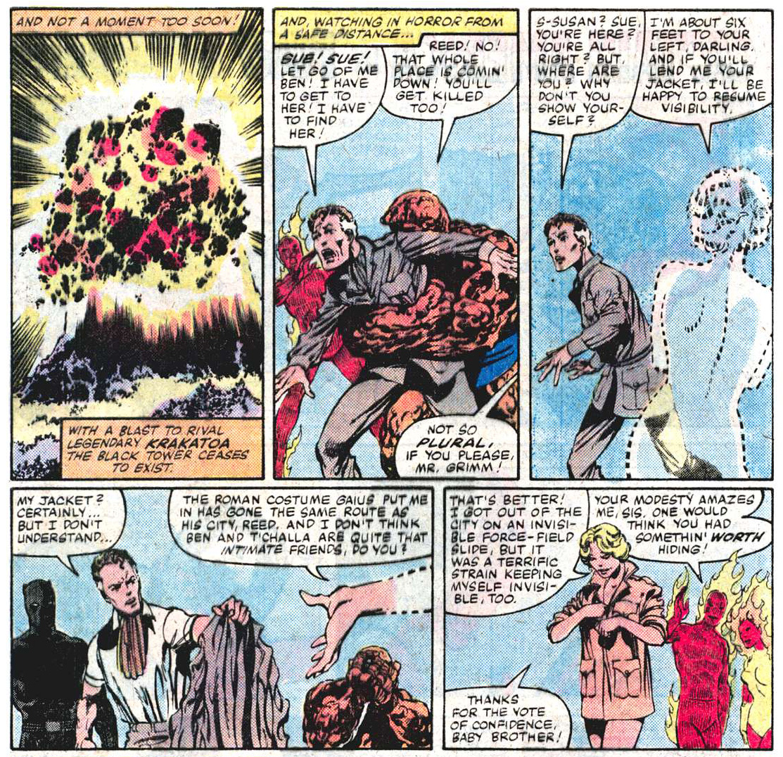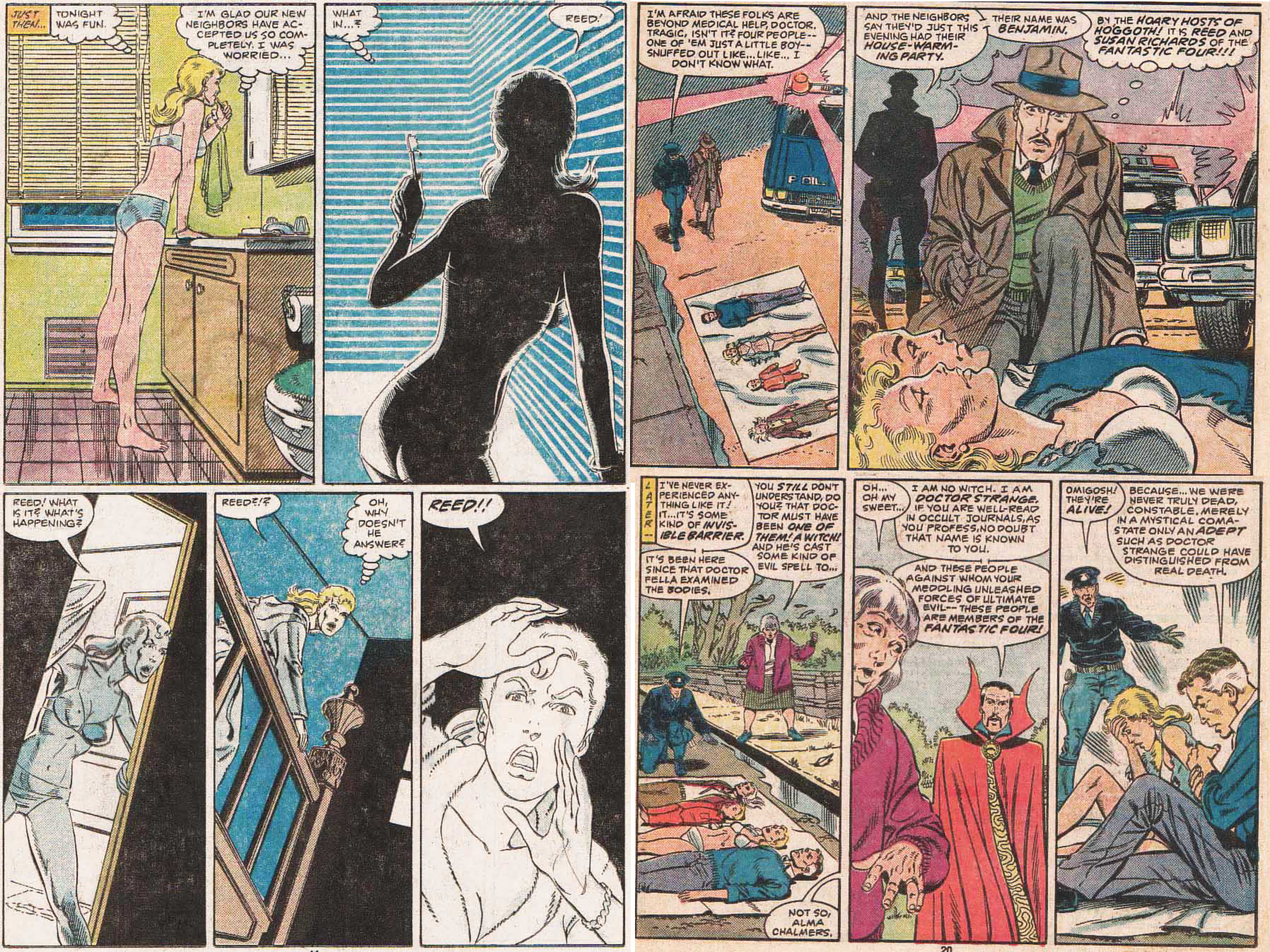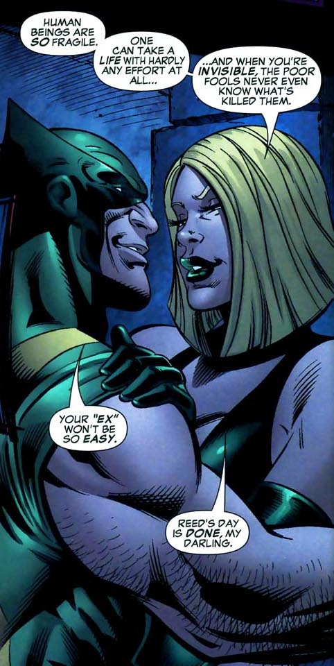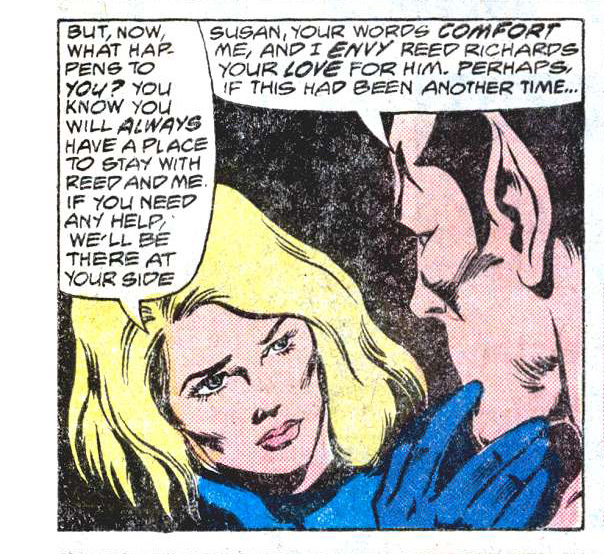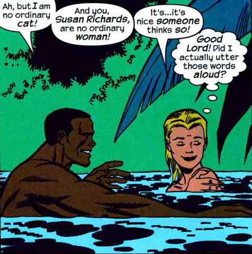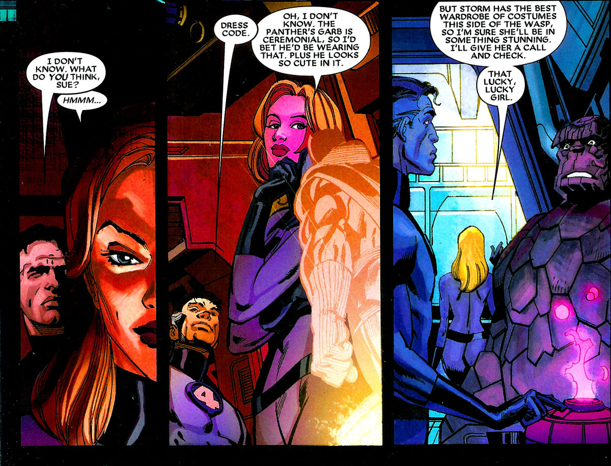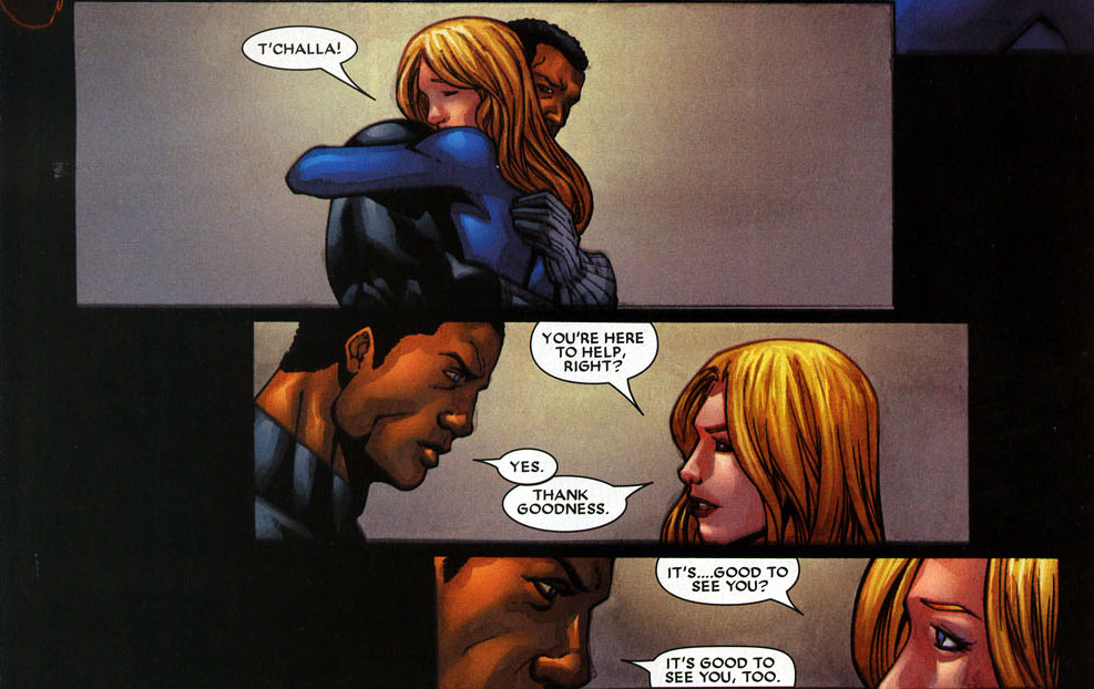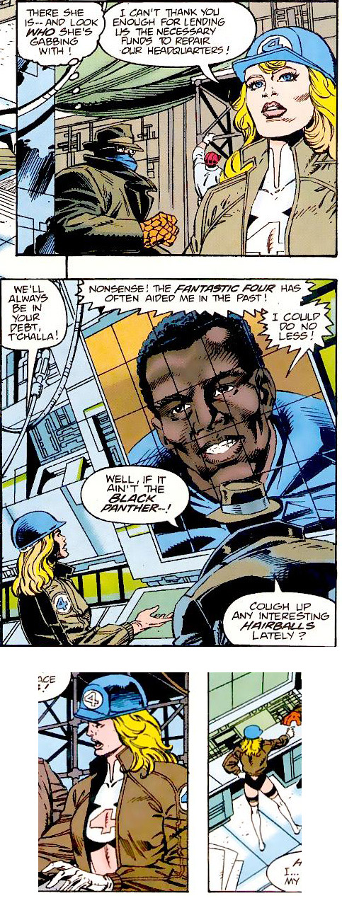 >1971 April Reed leaves Sue alone again as the men go into the Negative Zone, Sue is left watching them on screen. Maybe she’d have some kinky sex with BP, while the action goes on the screen? Later the same month, BP receives word of his regent dying, and contemplates returning to Wakanda to become king (he makes the decision, and leaves for Wakanda in May). Maybe the aforementioned sex in front of the screen is a farewell gift from Sue? >1972 January Crystal is mind-controlled by a villain, turns against Johnny. She’s wearing a revealing ethnic-themed dress. Maybe in our universe, it’ll give Sue some design ideas?.. >1972 February BP is captured in Africa. Reed sends only Johnny and Ben there, staying behind with Sue. Are there ulterior motives in Reed’s decision, is he trying to keep Sue from meeting BP? BP is freed, says he changed his name to “Black Leopard” (so that people won’t confuse him with the Black Panther party). >1972 October T’Challa arrives in New York to pose as Daredevil, and stays for a while – presumably, making up for the time spent away from Sue! And what a better way for Sue to greet a long-absent lover, than present BP-themed FF suit v2.0 (picrelated)! Sadly, she’ll only wear it for 2 months. Also, the impossible happens: Reed tries to leave Sue at home with Franklin again, but she disobeys! Sue and Reed argue. >1972 November BP (“Panther” again!) rejoins the Avengers once more (I like to think it’s Sue who told him last month, that the “Black Leopard” name is just ridiculous haha). Meanwhile, Sue and the FF are away on a mission to save Ben. >1972 December The FF returns, and almost immediately disbands because of the infighting between its members, all 4 members going separate ways. Sue may visit BP, who comforts her. >1973 January The FF get back together, but after the adventure Sue and Reed officially separate. Of course, we know who will comfort poor Sue. >1973 March Medusa takes Sue’s place on the FF. Maybe she “comforts” Reed? (the thought about the sex possibilities between a stretching man and a woman with prehensile hair is extremely kinky) >1973 May Sue and Franklin are in Pennsylvania at her female friend’s farm. Maybe BP visits her there? Later, Sue and the FF are captured by villains. >1973 June The FF free themselves, but Sue leaves again. >1973 October-November Sue’s still in Pennsylvania (leaves in November). >1973 December Reed infamously shoots Franklin and shuts off his mind. The FF disbands again because of this. >1974 January Sue drives back to Pennsylvania. Medusa comforts Reed again. >1974 March The FF is back again with Medusa in Sue’s place. Sue and Reed are still separated, Sue hates Reed for what he did. >1974 June In the original universe, Sue starts divorce proceedings. She tells the team she loves Namor and wants to stay with him. In our universe, BP would take Namor’s place, but with some changes (I’ll state some ideas how this may be handled below). >1974 July In the original universe, Namor attacks the surface world, with Sue by his side. >1974 August In the original universe, Sue gets back with Reed. Namor’s attack was revealed to be a plan to get Reed and Sue together. Next month, Franklin is back in action. Medusa’s still a member of the FF (Sue’s not, she’s just Reed’s wife). Meanwhile, BP leaves the Avengers, and prepares to return to Wakanda.