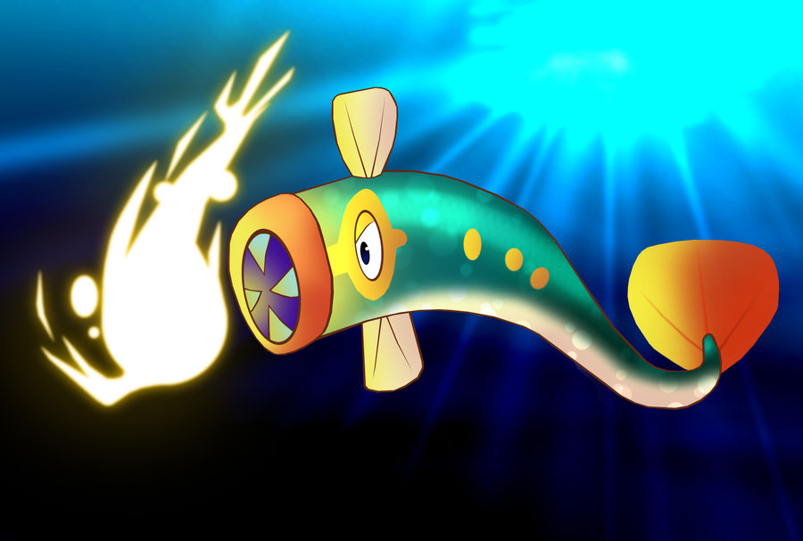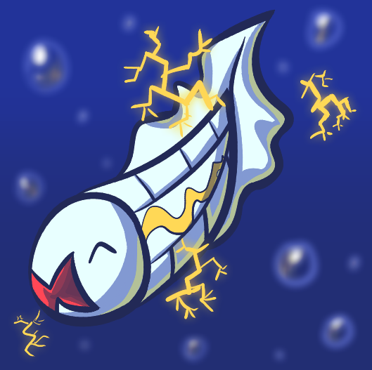 Shibirudon #604With its suction cup-like mouth, it sticks to its prey and, once it has sunk its fangs in, runs electricity through them to leave them shocked.