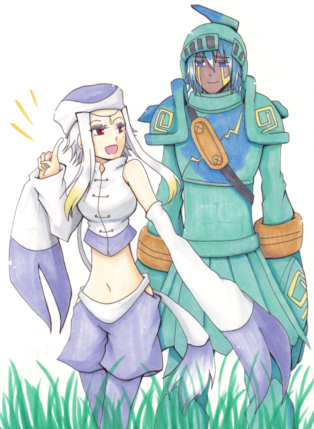 Nageki #538It has a tendency to want to throw around opponents even larger than itself. They usually form herds of five. Its power is increased when it ties its belt. Wild Nageki create their own belts by weaving vines.Dageki #539Once it ties on its belt, the destructive power of its vigorous punches increases. It gets angry if its training is interrupted. On mountains where Dageki train, sounds can be heard from their fists hitting large boulders and trees.(yeah I had to double up on this one. Nageki is red, Dageki is blue)