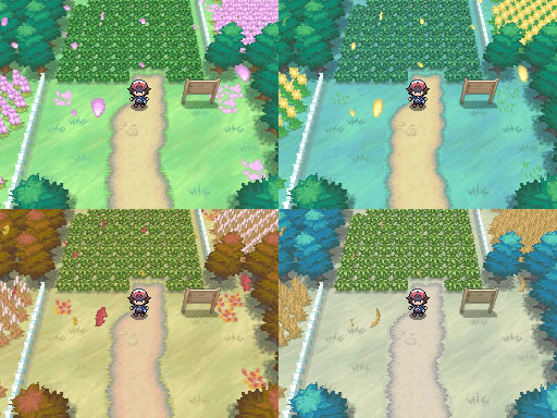 SEASONS: Every month is a different season in Unova, cycling through them just like we do in the real world, these season can affect the availability of certain pokemon and also create or block paths on the overworld! -Springtime weather appears in January, May, and September. Certain areas may have rainy weather. - Summer weather appears in February, June, and October. Morning begins one hour earlier, at 3:00 AM, while Day lasts an hour longer, until 8:59 PM. - Autumn weather appears in March, July, and November. - Winter weather appears in April, August, and December. Morning begins one hour later, at 5:00 AM, while Day lasts an hour shorter, until 6:59 PM. Due to snow piling up, certain areas can be accessed that are normally inaccessible.