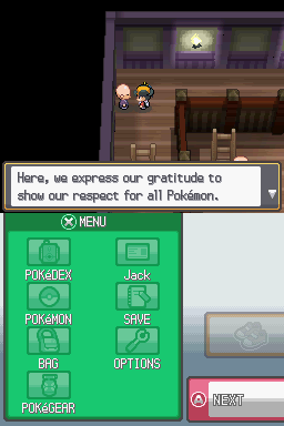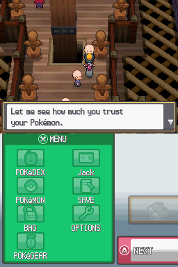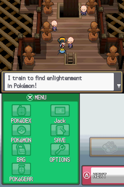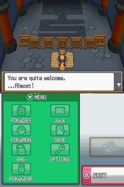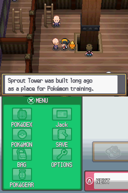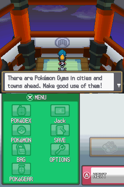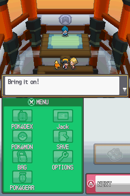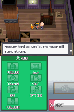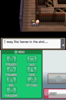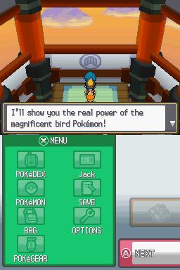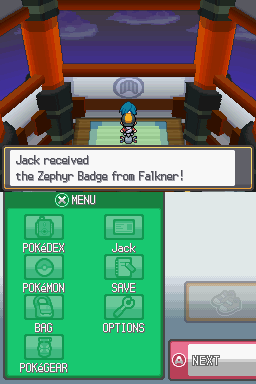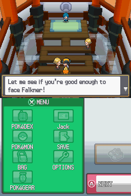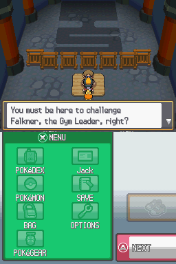 Falkner: "Not that it's any of my business, but there IS a gym west of here in Goldenrod. Whitney I think is her name. She uses Normal types, so she might be worth fighting if you have so many Fighting types..."