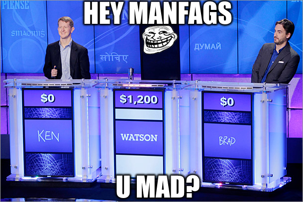 I really feel this whole thing was silly. In all honesty, all three contestants (and myself, at home) knew the answers to the vast majority of the questions. The ONLY reason Watson won was not because he had a bigger base of knowledge than the humans, (I bet my balls its not as much by HALF, if that) but because it was capable of buzzing in faster. Only in the last few minutes of the last episode did the two humans start to be able to catch up. You'll notice Brad especially began to beat Watson's speed late in the game, but it was too little too late. Give them a rematch, and I think they can win.