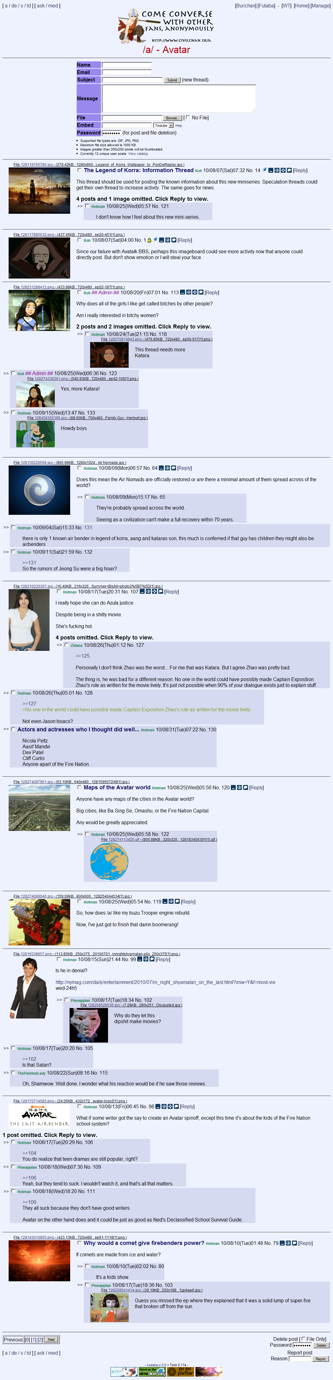 Not trying to viral market what is in the image, but I was wondering if the folks here go to any other Avatar imageboards, forums, or communities? I usually just go to Airbender.net, KorraForums, and Civilchan's /a/.