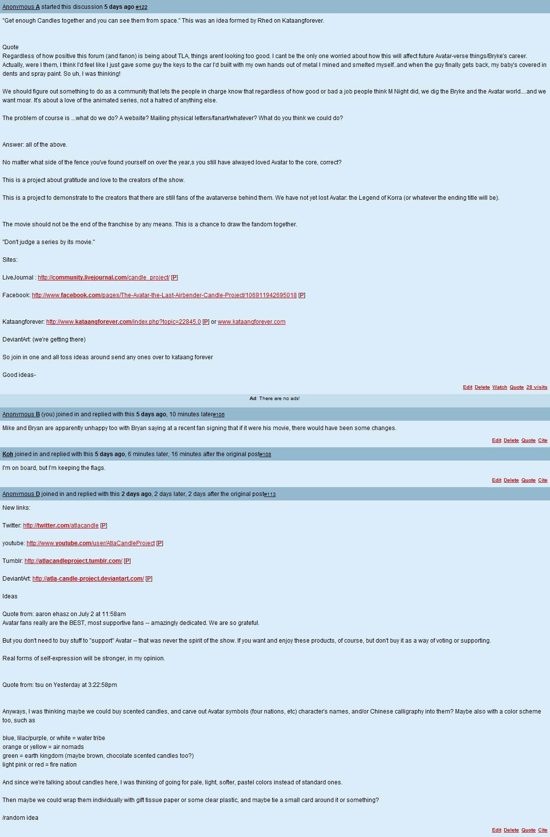 Right before autosage, the last thread had a bombshell dropped in that working television voice actors and writers were actively participating in this fan project.A bunch of successful 20-or-30-somethings are helping to make a young teen's dream come true.I think the creator must have a terminal disease or something.