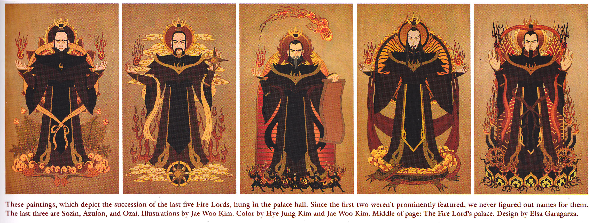 Some of the symbolism on these paintings is obvious (the Comet on Sozin's, the gears of industry for Ozai), but what do you think about the others? What's the turtle-like thing under Azulon? And what's the moon-and-sun symbol for the Fire Lord before Sozin? Would that be an eclipse, the "darkest day in Fire Nation history"?