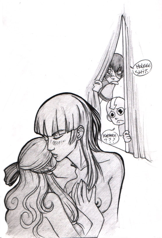Obligatory fic incoming:Katara bit her finger, struggling to quiet the pleasured groans fighting their way out of her. If she was any louder Toph would hear them even from this corner of the Western Air Temple, and after the fuss she'd made about not letting Zuko's girlfriend join the group, she hated the idea of being found out for the hypocrite she was.Noting her lover's agitation, Mai slid a long, slender finger across Katara's lips, still sensitive from fevered kissing and parted just so from the intense sensation running through her. Katara seemed to quiet a bit, as if forcing herself to ignore what Mai was doing to her, but then a pointed fingernail scratched the little bundle of nerves crowning her labia, and the Waterbender squealed like she was in the sweetest kind of pain. Forcing her eyes open just a sliver, Katara saw Mai's piercing gold eyes fixed on her, the slightest hint of a commanding smile on her slender, defined lips.The Waterbender hadn't taken very kindly to Mai at first-- she mocked her as she had Zuko, belittling the knife expert, wondering aloud what the exiled prince saw in her morose expressions and sullen monotone. The comments seemed to bounce off Mai though, the way they had with Zuko, except that when she slighted the noblewoman she caught more than a few deadly glances from the Firebender.Katara soon found out, however, that Mai was far from a cold fish.Adding another finger, Mai pumped in and out of the Waterbender, her movements precise and efficient as she seemed to hit Katara's every weak spot. For her part, Katara was just trying not to hyperventilate; she was breathing so fast that if Mai didn't stop she might die, but every time her teasing pace slowed even the slightest Katara whined incoherently while her hips feverishly met Mai's thrusts, her body doing the begging her mouth was too numb with pleasure to attempt.