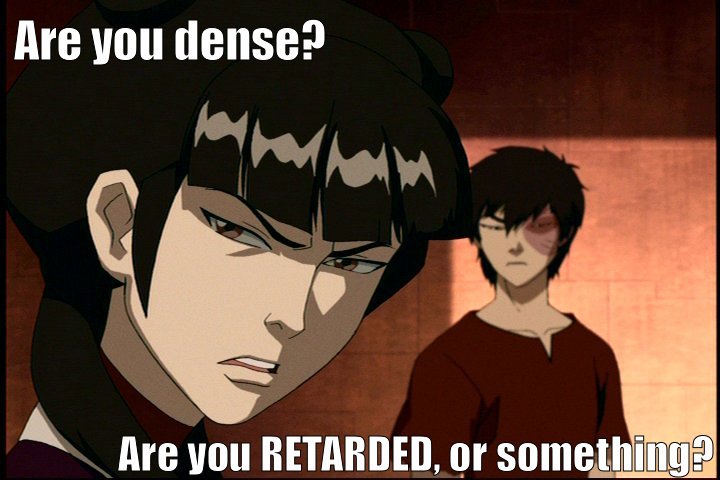 >>74760He was drawn with hips to fit the role he was given in the picture. It's a GAG picture. Everyone knows he doesn't have hips like that in the series.>he's hot headedWhat does that have to do with being masculine? Katara is hot headed, too, and it's doubtful anyone would make a case for her being manly for it.You're right. He tries way too hard. And, to me, he comes across as dorky more than "manly", or the suave lady-killer he's sometimes portrayed as. I never said he was girly. I just don't see him as being as masculine as some people claim.Fandom takes extremes with Zuko. He's either too girly or too masculine.>>74761"Get out"? Why does someone's perception bother you so much?No one's going to contest Wang Fire's manly might. That's pure fact.