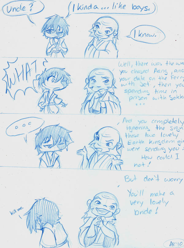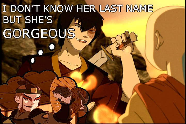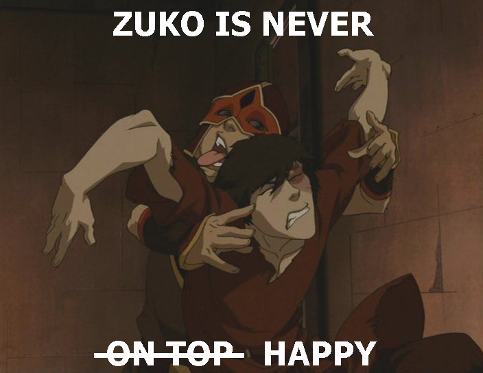 >>74759Okay, gotta chime in on that one, that's bull. Zuko is usually made a lot more femenine by the artists, sure, but in the series itself?He doesn't have hips like the way he's drawn here, he's hot headed, very defensive of others looking at his girlfriend, and quick to challenge others to an Agni Kai, which is *nothing* if not some overtly machismo contest of honor.If anything, you're better off making the argument that he's trying too hard to be masculine, or even compensating, but all in all, Zuko's not very girly.