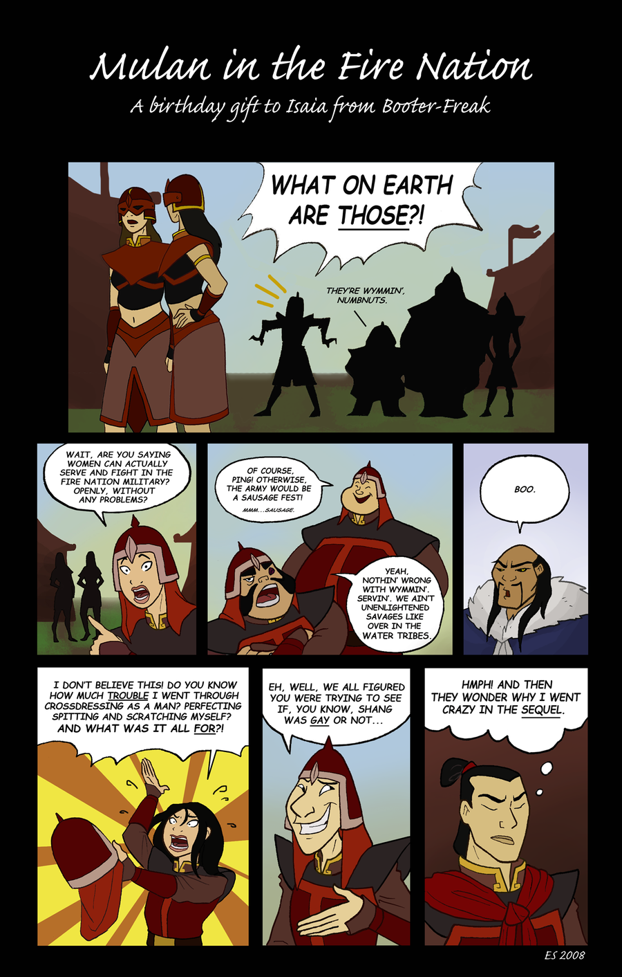 >>65718I have seen worse (he had the abusive and power hungry nutbar thing down pat), but I freely admit fleshing out the guy a bit would not have hurt.>>65801Agreed. I would go farther and say that Azula's absolute loyalty to Ozai is the main reason he is still alive (especially after the Day of Black Sun, but a discreet knife in the back followed by a frameup was well within her ability to begin with).>>65880> My headcanon Ursa would STAB Ozai, bender or not, any time after she meets with him after Zuko's post-burning.Quoted. For. Truth. Frankly the "romantic reunion" vision of thier future relationship disturbs me on multiple levels.Yes, I see Zuko forced to give his mother an akward lecture while she gets her hands and feet patched up after her first visit to Ozai.