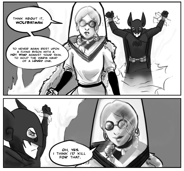 >>73338I don't know, I think there could be merits to having an inhuman protagonist. I had some spare time and a bout of inspiration, so I doodled out a quick one regarding how I think might be an effective way to successfully introduce such a being.Okay, I'm obviously screwing around, but come on, if your big bad is an undead airbender, just go for the gold and throw reason to the wind. I mean, look at this fucking guy! He's riding a goddamn rocket mounted T-Rex head and he's fuckin' rockin' so hard there's goddamn lightning and shit! Fuck! I don't wanna take this guy on! If he wants to Dawn up some Darkness, you goddamn well let his ass!So I think the concept deserves at least a bit of thought.If you guys actually do this, I would love you in ways unfathomable to mankind. The love a parent has for their child, of a lover for whom is in their embrace. It will seem a trifling and fleeting thing. I would love you as I would gods.