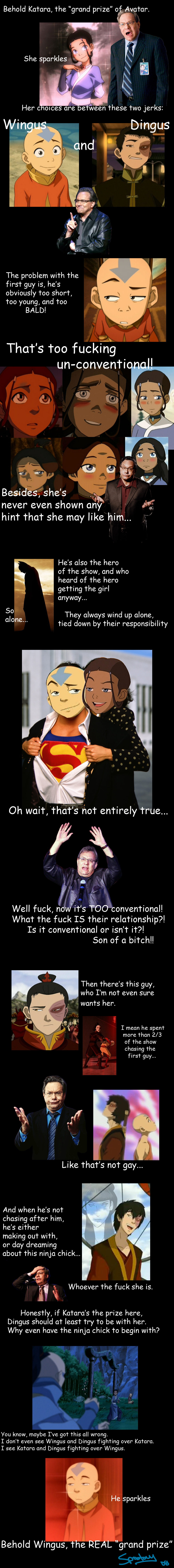 >>78032>Why is Katara the only one who's holding back? Because her happiness is more important than Aang's, duh!You really expect her to concede so he doesn't risk his life, while having no reason to survive, since the woman he loves just brushed him off?Clearly we all have the wrong idea of her character.