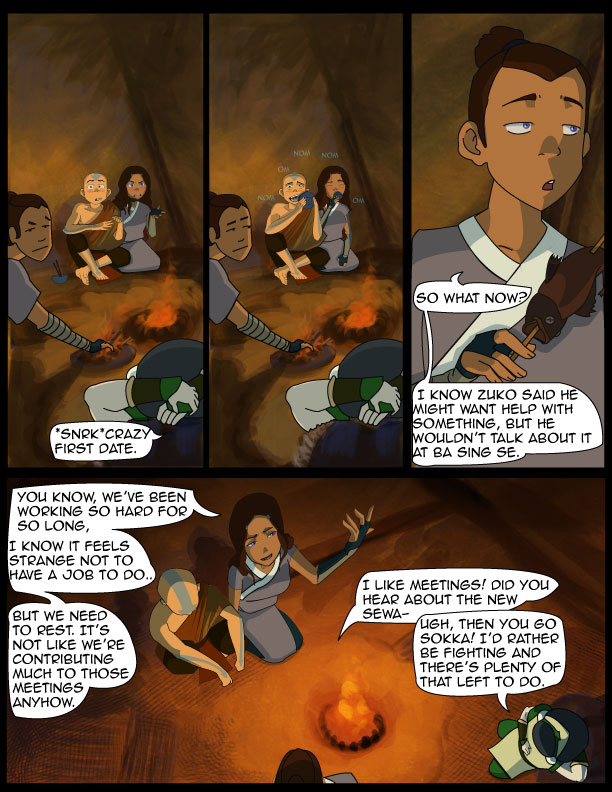>>77984Maybe she wasn't fully ready to admit that to herself, much less to Aang? She hadn't been confronted with his feelings since the failed invasion, and in that time, Aang and Zuko went off to the Sun Warriors, he was busy with the training Zuko told him to do for that day, then they had to run for their lives, then it was revenge-o'clock, then the play, after who knows how long since he kissed her on that sub at a moment when they weren't sure if they'd see each other again.It's not so easy to say things when you're a 12 or 14 year old who think you might be in love, you know.