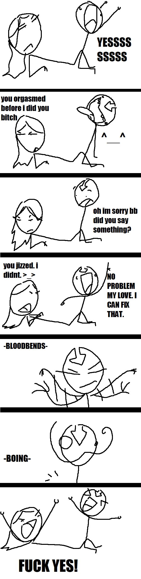 IT HURTS. IT HURTS SO MUCH AND I HAVE TO SHARE THE PAIN.http://coolpenguin55.deviantart.com/art/Kataang-Too-Young-For-This-CH3-154421127[/spoiler]Somehow, they lovers managed to maneuver their way into the bedroom's bed, and were they were stripped down into only undergarments. Aang fell on top of Katara, unconsciously moving his hands under her bra. He flinched once he realized what he was doing, breaking the passionate kiss with Katara."It's okay" Katara muttered, gasping for air. He slipped off the brazier, with her chest now completely bare. Aang rubbed his hands all over her body, caressing her abundant chest. Katara mounded with pleasure as she kicked off her panties and dragged her boyfriend's boxers down with them. Katara began to suck on Aang's neck, giving hickeys all over. Finally seeking the opportunity to impregnate his girlfriend, he stuck his hard package into her. Katara winced in pain and lust. Faster and harder he struck her as she held onto the bed sheets for dear life."Aang...Aang...Aang!" She hollered as juices overflowed the both of them. They both gasped for air as Aang fell next to Katara.In the quiet of the little village's night, the two lovers huddled into each other's arms. Aang kissed Katara's soft forehead, and whispered "I'm so sorry. I don't think we were ready for this." He murmured, suddenly feeling like his soul had been disconnected from everything else, the past avatars, and all his friends. Everyone, except for Katara, who felt closer then she had ever felt before.From outside in the small town's streets sang one of the most beautiful voices eatheir one of them had heard, singing a quiet, caring song.Maybe there's a god above,But all I've ever learned from loveWas how to shoot somebodyWho outdrew you."Isn't he gorgeous?" The young lady whispered, not afraid to look up at her boyfriend in the eyes. Despite all the nasty things he just did to her, he smiled back.and it's not a cry you hear in the nightIt's not somebody who's seen the lightIt's a cold and it's a broken hallelujah"I'm sorry, too. But what's done is done." She ran her dark hand over his bald head, over the tip of his arrow and followed it to his neck. The moonlight over spilt onto both of them as he smiled, suddenly feeling the presence of another soul watching over them, keeping them safe. (As well as the other avatars)"I think they deserve that baby, Master Ruko." Yui cooed as she let her light shine through the window of the two lovers curled up together. Ruko smiled an old, wrinkly smile."Yes." He agreed solemnly. "As they will get."