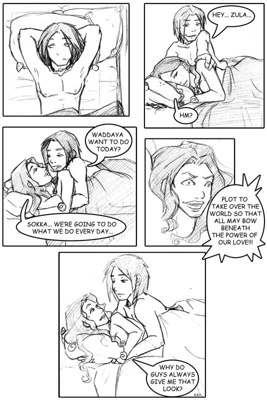 I actually like Azukka, or Sozula, or whatever you want to call it quite a bit. It's a crack ship, I make no excuses, but I think it's cute. I think Sokka and Azula would compliment each other quite well; each of their personal brand of crazy would cancel out the other. And the kids would be super-geniuses, hoshit. Nothing against Suki or to a lesser extent Ty Lee, I think Sukka and TyZula are pretty awesome, too.