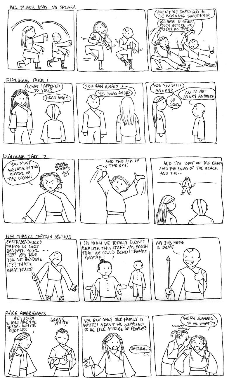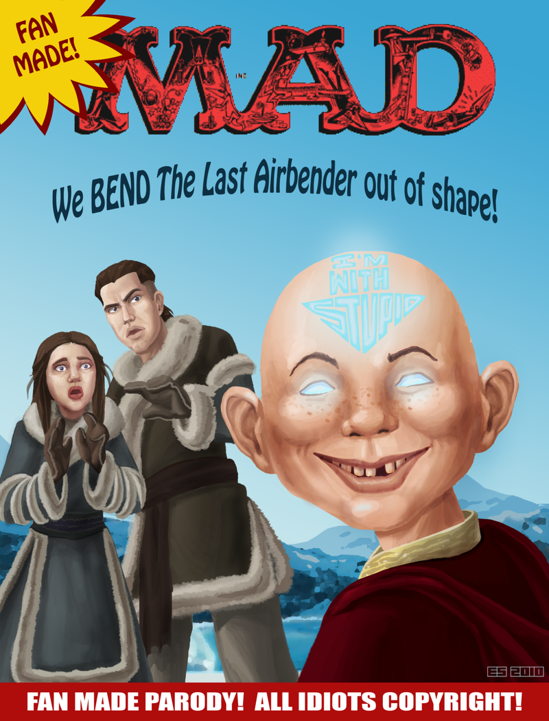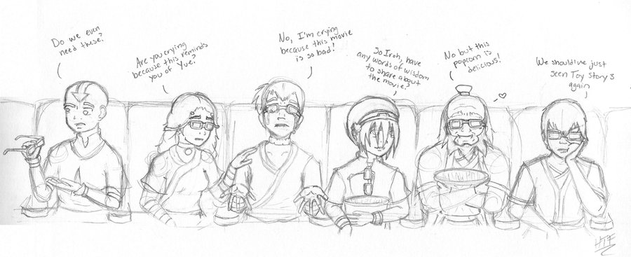 I don't know whether to put this here or in the awesome art thread. Here are the artist's comments:>I was so excited about seeing Toy Story. I'd been looking forward to it for days. And then when I am five minutes away from the theater, Debbie calls me and says they're not showing Toy Story anymore. Airbender's playing, though, do you want to see Airbender? >I knew it was bad. I knew it had gotten horrible reviews. I didn't want to spend money to see it. But in the momentary devastation of not seeing Toy Story I said okay and pulled into the theater parking lot.>And when I emerged, this is about how I felt. I hate that I have given seven of my precious dollars to M. Knight Shyamalan.>I have formed the reasoning that since they mispronounced at least three main characters' names, it is a different set of characters all together and that there just happen to be some slight similarities between the movie and tv show.