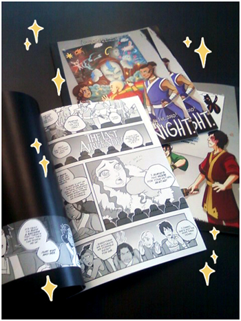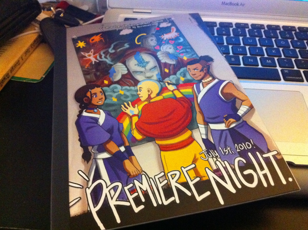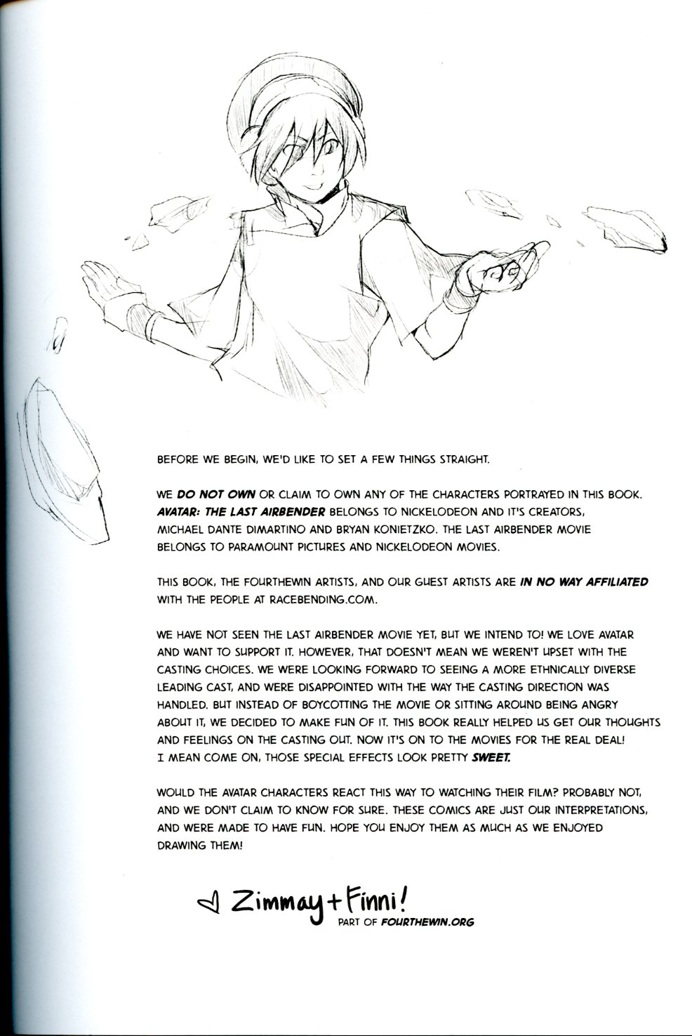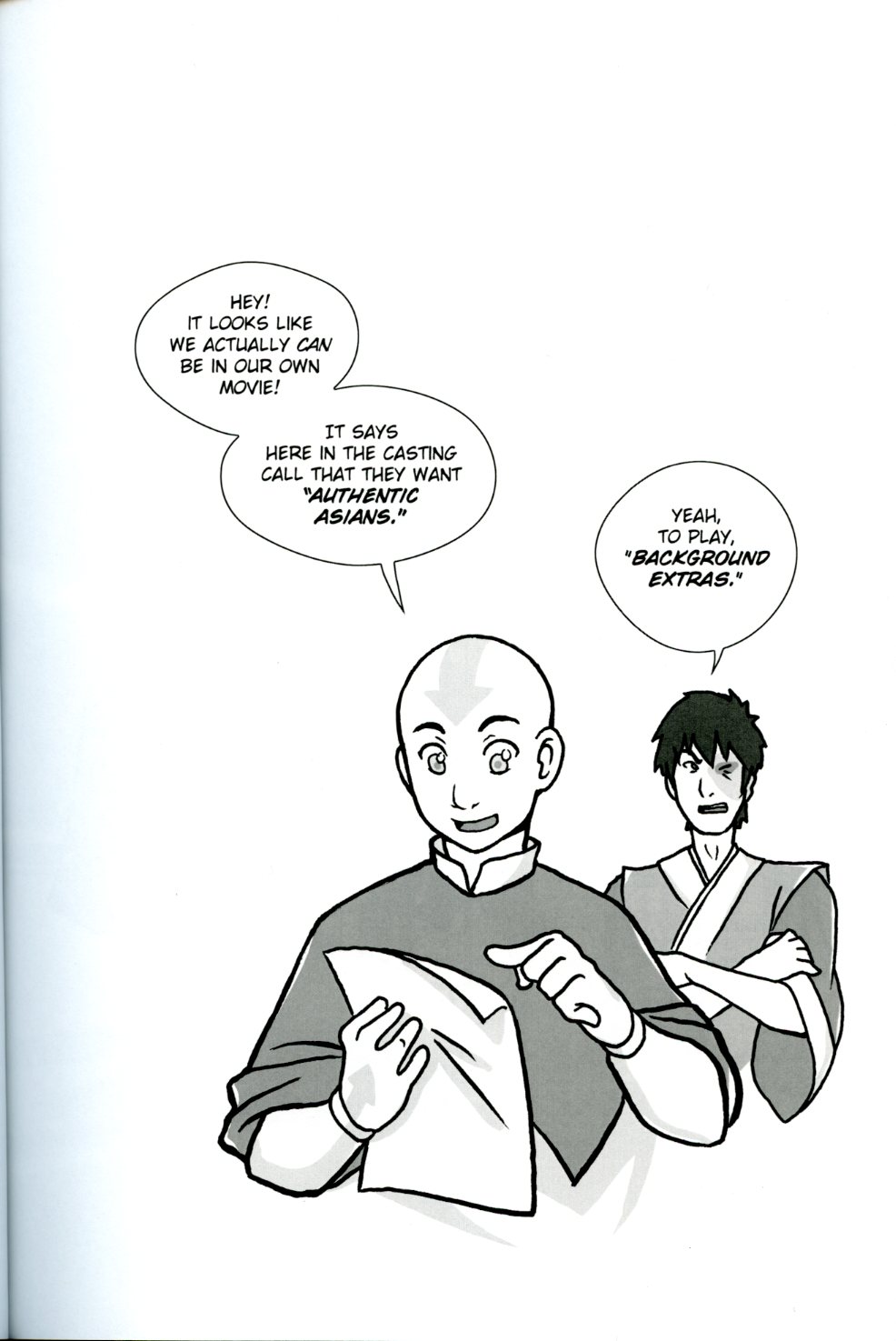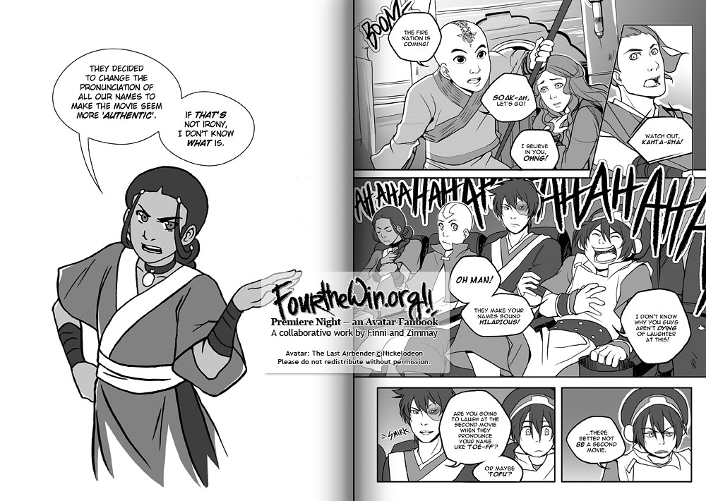 Right, I have time to post up a review.In a quick summation: the artwork's nice but I'm actually a little disappointed.The book opens with them making a few disclaimers. Aside from the obvious one of them not owning the characters and that this was a parody work it also clears up two things: that they're not associated with the protest movement, choosing to make fun of the movie rather than get angry or boycott, while also acknowledging that they would have wanted a more accurate or diverse cast. The second disclaimer lets the reader know that at the time of the creation and printing of the comic, they had not seen the movie.And it shows.Despite them claiming they aren't associated with the protest, they sure draw a great deal of their jokes at the movie at the casting and the cultural blockheadedness of the movie.If you were hoping for a play-by-play in depth kind of deal of the characters essentially MST3K-ing the shit out of this movie, you're not going to find it here. Most of the shots taken at the movie relate to the casting, the seriousness, and the name pronunciations, and all in all, rather generic things to talk about the movie, which seems like a wasted opportunity given what ended up being the best unintentional comedic moments of the actual film.Very few pages of the comic itself are actual sequential art. Of the entire thing, only seven are actual comic pages, two of which are an opening joke of them seeing James Cameron's Avatar, not The Last Airbender.The rest of the comic pages done by the artist are usually one-shot drawings of other characters, typically poking fun at either the Faux Pas of the casting calls, or making a joke about Soak-uh being a Vampire or Eeroh looking like Jack Sparrow.One gag that was in it was Soakuh and Movie!Yue share a kiss, it cuts to Suki getting angry and cracking her knuckles, with Sokka trying to calm her down saying "I swear you're in the movie, I-I think you're in the movie a little bit. But she just punches him for his efforts. Actually, I thought that was pretty out of character, if anything, tsundere joke notwithstanding.One that I thought was kind of humorous was Song reading DeDe Ricket's flub about "Korean Kimonos." Song wears a Hanbok, she's probablly Korean as all getout, but that drawing, (which takes up a whole page, and has no background,) along with others made me wonder, and here comes a tangent:...Why bother saying they're not associated with the protest when the comic touches on it so damn often? And specific issues, too, so it's not just a passing complaint for these people, they know specifically some of the things wrong with the casting and the production, but that disclaimer?>"We have not seen The Last Airbender movie yet, but we intend to! We love Avatar and want to support it. However, that doesn't mean we weren't upset with the casting choices. We were looking forward to seeing a more ethnically diverse leading cast, and were dissapointed with the way the casting direction was handled. But instead of boycotting the movie or sitting around being angry about it, we decided to make fun of it. This book really helped us get our thoughts and feelings on the casting out. Now it's on to the movies for the real deal! I mean come on, those special effects look pretty sweet.Just sorta comes of as "Well, yeah, it's racist, but it has shiny effects!"(And now, for cynicism!)>But instead of boycotting the movie or sitting around being angry about it, we decided to make fun of it.And make money off it.>This book really helped us get our thoughts and feelings on the casting out. Now it's on to the movies for the real deal!Feelings not strong enough to overcome a fan obligation to see something even if it offended them somehow, I suppose.Anyway, aside from that, there's a lot of pretty drawings and one-shot gags, but little content in terms of a story, and the book likely could have had much more (both in terms of length and specificity) if they'd just waited to see the movie somehow before starting on this.Was it worth the ten bucks I gave them and four bucks I paid to have it shipped? Tell the truth, I'm doubtful it was. I'll probably scan this after the con they're supposed to sell this at, or perhaps earlier. My scanner seems to be able to fit it well enough.