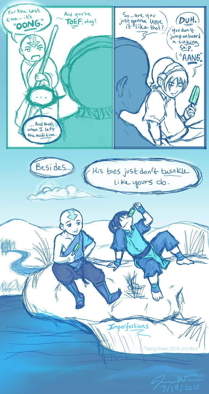 Off topic, I thought we already had a Taang thread...or did it fall off the board already?Also:>I'd love to see some good Taang -- the problem is that so much of it out there just has Toph being the blushing, vulnerable girl that Aang has found after getting past her tough exterior. It's true that Toph does have a more vulnerable side, but revealing it should be a rare moment -- and since everyone seems to focus on just that moment it ends up defining the ship in a way that removes Toph's main personality.Agreed.>>82368I like this one.