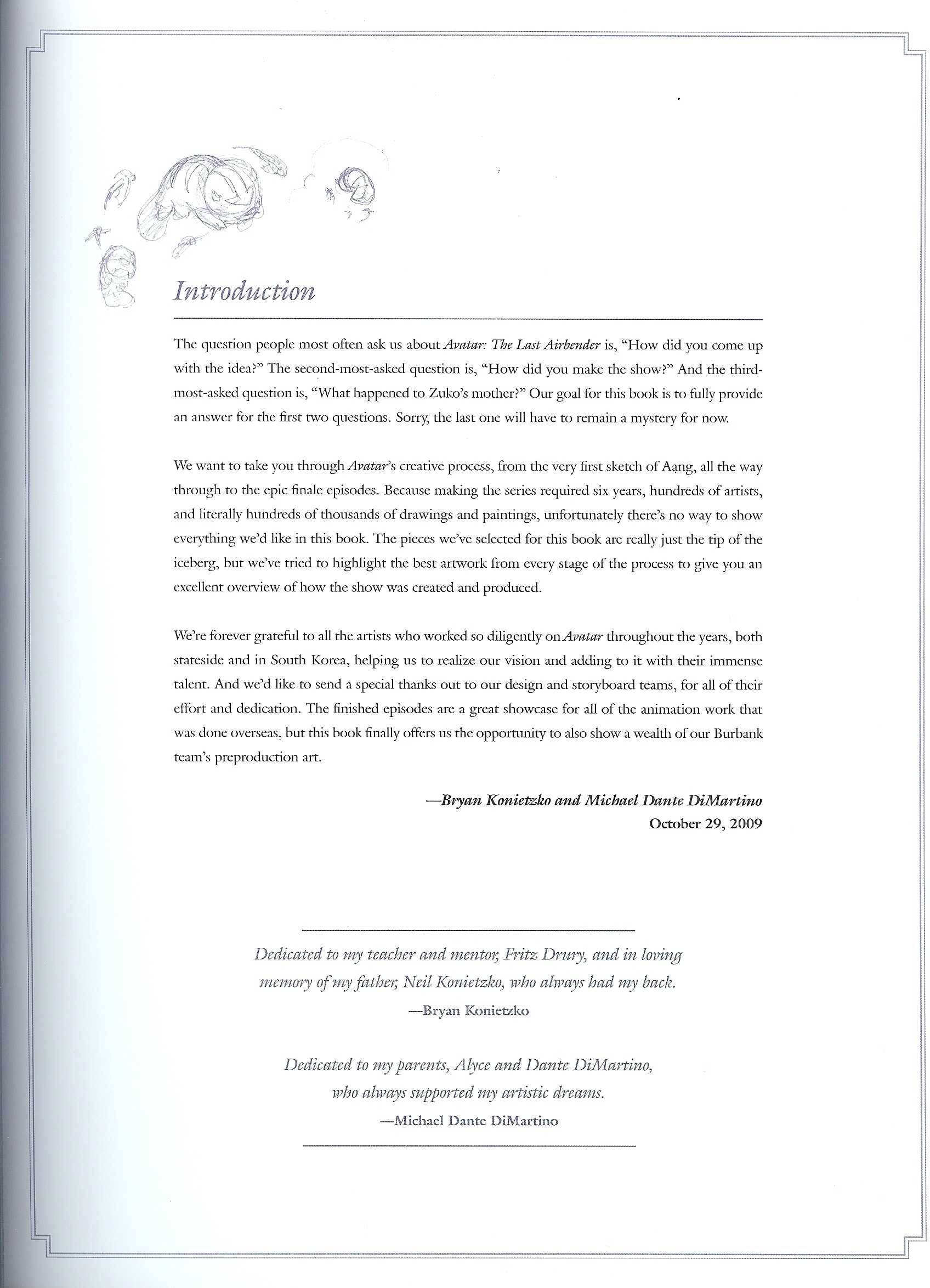 It just got to my house yesterday. I'm surprised at the size (as in height and width) of the thing.>>84908Yeah, me too.Memorable lines:>Once revealed, I wanted [Bumi] to have the creepy, long-limbed, hunched posture of Gainax's Evangelions.Can't unsee.>The idea for Zuko's disguise and the plot for "The Blue Spirit" came to use very quickly after that, but initially in the writers' room we thought of him as teh Red Spirit... Unfortunately, with the red mask he was looking a bit like an ancient Korean version of Spider-Man.>Chong: Think ancient Tibetan T. Rex/SlashlolMai apparently had another pair of those spring-loaded bolt launchers on her legs but I can't remember if she ever used them.I'm surprised there were so many character-designs based on real people we hadn't heard about before (all the pirates from "The Waterbending Scroll" but the leader, Jeong Jeon, Due, Tho, Joo Dee, Chit Sang, and to a small degree Combustion Man).