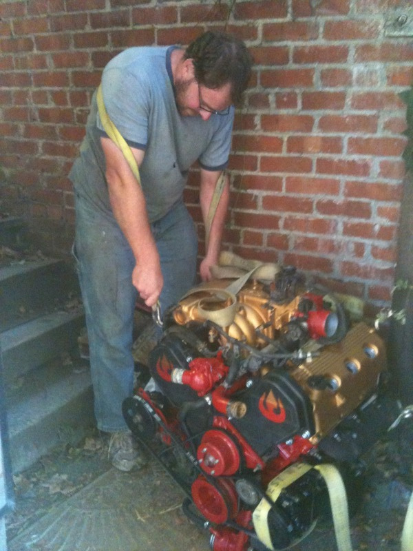 Guess we'll just have to man handle it!This is actually after we got it down the stairs, but you can see how we lifted it (that's me by the way). We took some straps, tied them to anchor points on the engine, and slung them over our shoulders. That way we could carry it in a way such that our legs were doing most of the work instead of our arms.Now all that's left is getting this thing put back in my Isuzu Sky Bison, uh, I mean Trooper, my Isuzu Trooper (damn did I just give away too much info on what we plan on doing to the outside of my vehicle).
