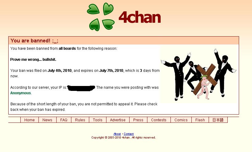 >>252920If it's so easy to re-gain entry into 4chan if you are banned by just shutting off your router for a while, then how come this person has stayed in banishment for 760 days?