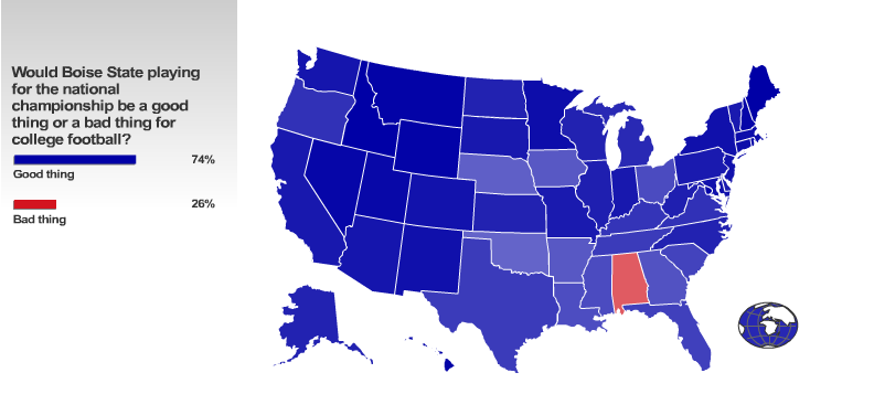 Ehhhh... the BCS makes a LOT of money with its current set-up, and I do like the various bowl games rather than a "tournament"-style final round like the Pros. The bowl system is great for the mid-tier teams, which get to play another team of similar strength as their final game and can end their seasons on a win. I don't realistically see the BCS coming apart until it becomes unprofitable, because people have been talking about getting rid of it for the 15 years I'VE been following college football. What I WOULD like to see is Boise taken out of the WAC and put in an actual conference.