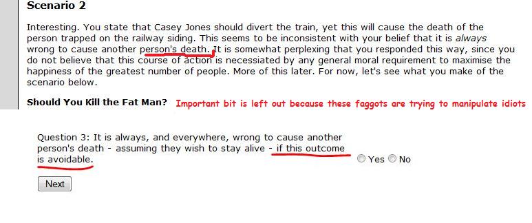 this test is beyond retarded.If you believe stealing is wrong and then you go out and steal, that doesn't mean you are morally inconsistent, it just means you did something you think is wrong.Also; there is no way in hell A) Pushing the fat man on the tracks would stop the fucking train.B) You would ever know if there really was a 75% chance that torture would have him reveal the answerOf course what do you expect from a stupid fucking internet survey. Can't take this shit seriously.Thanks for wasting my time Sogeking.