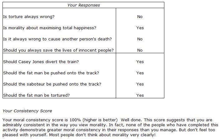 You know how I always said you guys were terrible people? LET'S PUT THAT TO THE TEST!http://www.philosophyexperiments.com/fatman/My score:> Your moral consistency score is 100% (higher is better) Well done. This score suggests that you are admirably consistent in the way you view morality. In fact, none of the people who have completed this activity demonstrate greater moral consistency in their responses than you manage. But don't feel too pleased with yourself. Most people don't think about morality very clearly! My answers:Torture isn't always wrong.What makes the most people happy isn't always right.Death is sometimes justified.You should always save the lives of the innocent, if it is in your power.Don't divert the train.Don't sacrifice the fat man.Kill the saboteur.Torture the saboteur.