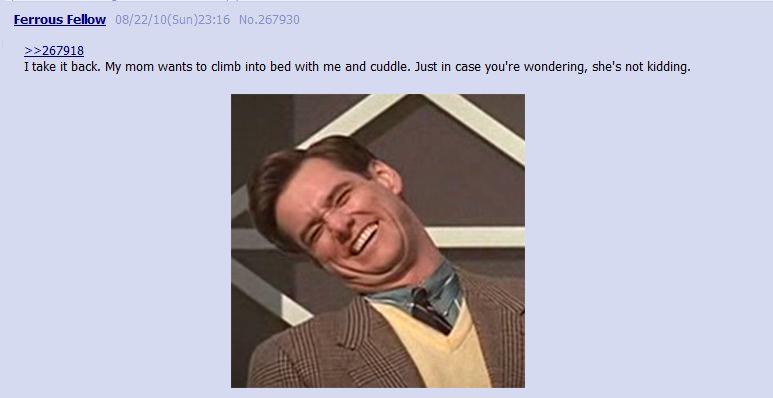 >>267930>mom>cuddleAwwww, do you also hold hands in public?I didn't know you were five.
