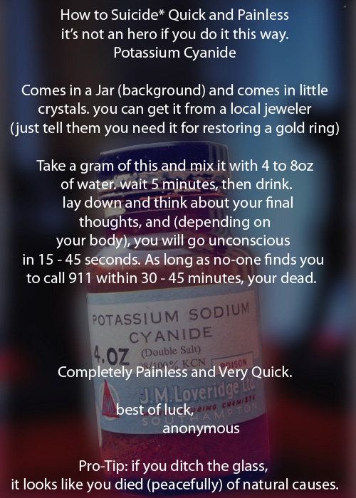 >>273453You can't blame yourself for anyone's decisions but your own, TD. I'm so sorry to hear that. If you need someone to talk to, I've got a few instant messenger programs.