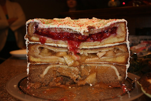 With the use of SCIENCE! I no longer have to choose.Cherpumple Pie Bottom: pumpkin pie inside a spice cake, middle: apple pie inside a yellow cake, top: cherry pie inside a white cake, all surrounded by cream cheese frosting.