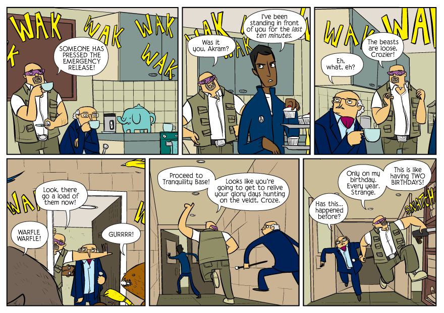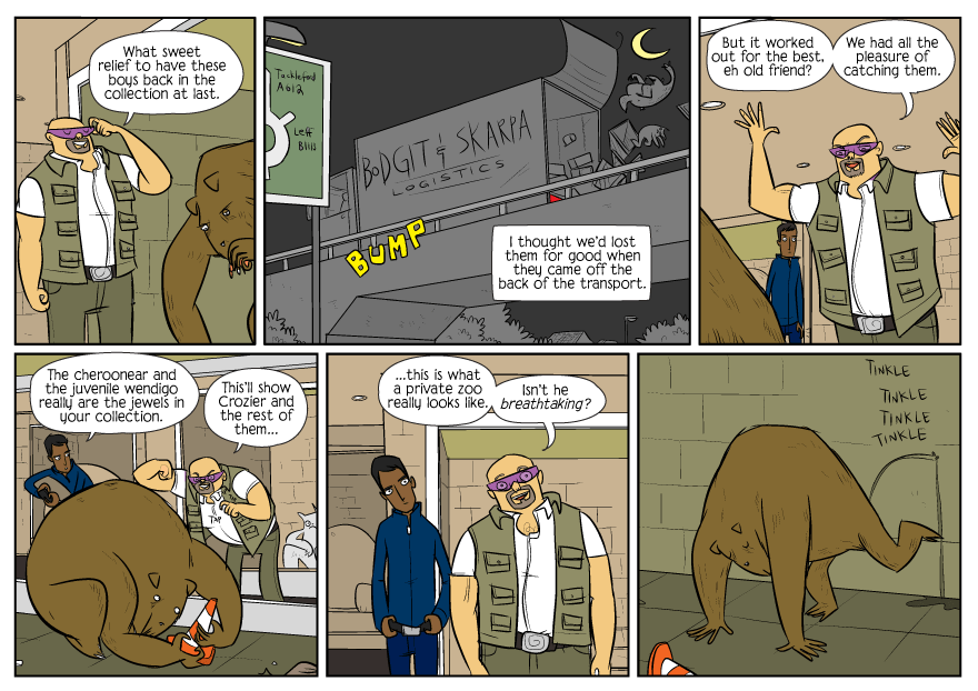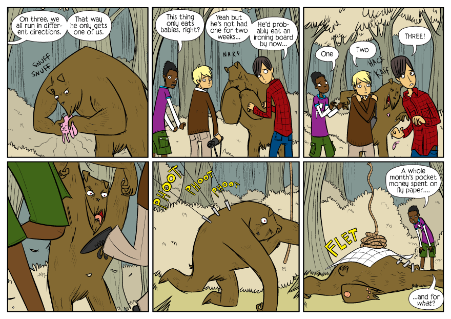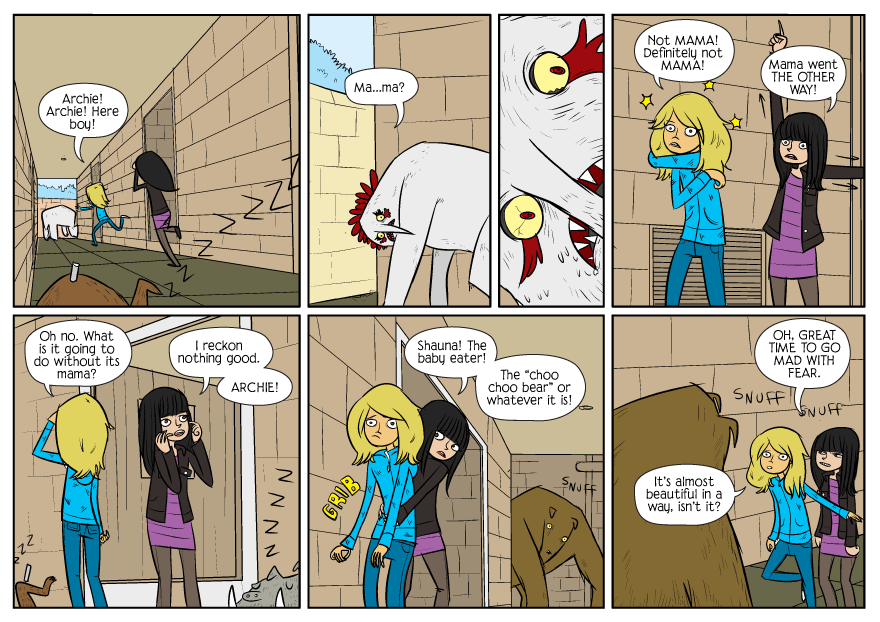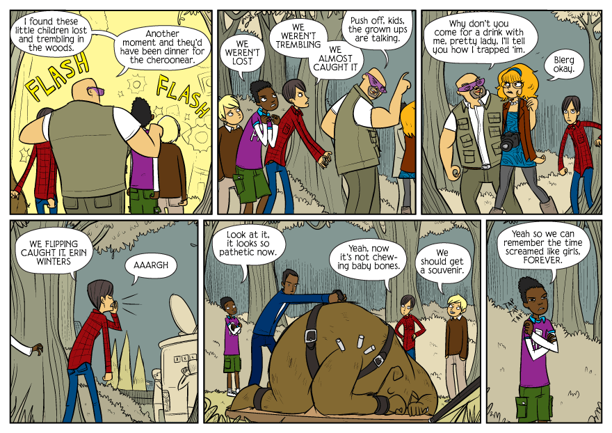 >>92413SHRIEKTranslation of text: "I'm thirsty."...Oh, hey, wait, I was hoping it'd hang around to vaporize (or at least trophitize) Mr. Bloem the Big Game Hunter.While we may be closing in on the finale, I imagine we've still got some issues to settle with the boys, and I still don't think Choo-Choo-Bear is the culprit. Also: That one thing SPOKE. Still freaking out about that, yes.Panel 5: Is that DAWWWWW or what?