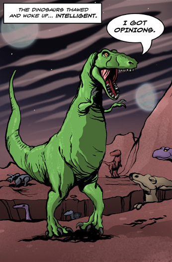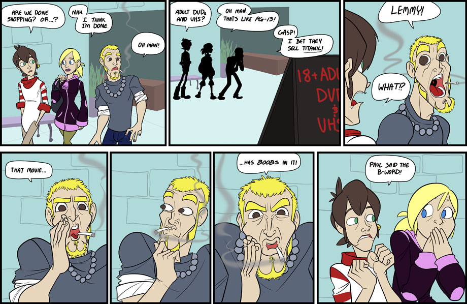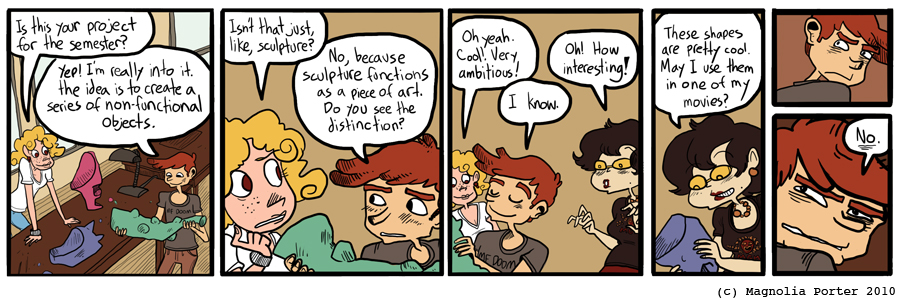 >>94604I *want* to be happy, but this also makes me want to go ahead and delete my bookmark.His "comeback" set of strips ("Whatcha Watchin'?") features a self-torturing artist (strip 1) killing himself (2) and his family (3). The unfinished story arc was clearly leading up to his primary characters acting out a "Final Destination" scenario. Yeah, I think I can read between *those* lines. Sure, he says everything's getting awesomer now. We'll see. Maybe.The vast majority of webcomicers, I've come to realize, are emotional eggshells who act like they're aluminum baseball bats. I deliberately trolled one who was using his newfound tiny fanbase as an excuse to scream U R ALL DUMFUX IM BIGAR TAN JEEZUS at the world, including his fellow artists. His responses alternated between LOL U MAD ROFL!!1 to playing the ol' race card to screaming rants against other critical posters he assumed to be me--before finally cooking up a SUPER COOL STALKER STORY BRO, complete with a fictional (and bizarrely homoerotic) threat (naturally "reported to my ISP and the authorities," who strangely had no idea what I was talking about when I inquired, honk honk). Cherry on top: he strongly suggested he might commit suicide if I wasn't dealt with. (There's a SUPER COOL SUICIDE STORY BRO in the site's history, apparently.) I was peebo'd, but it was totally worth. And he hasn't been acting like such a complete and utter asshole lately, so maybe it all worked *exactly as planned.*)The difference here is, I like "Fanboys," and I have no personal opinion of DeWitt beyond the strip itself. But I don't want to sit on this bus while he keeps asking, "Which would you do? Pills or razor blade? I'm not gonna do it, I'm just askin'."