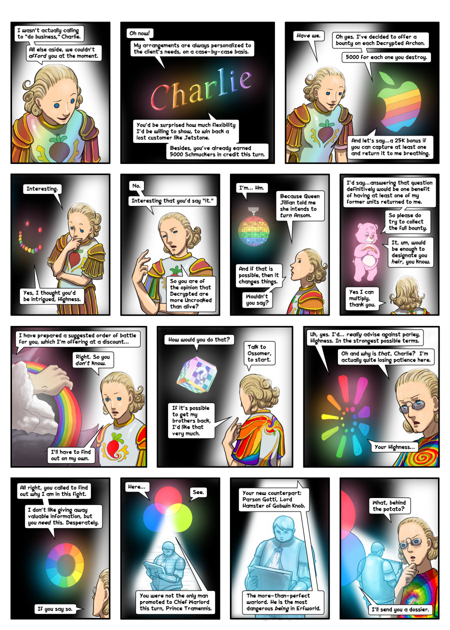 The last several pages have been discussions between Charlie and Tramennis, two of my favorite characters. Nothing but discussions, exposition and plot stuff. And I love it.