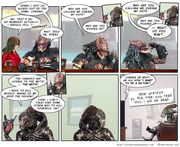 >>60633>Then your thread either gets hijacked etc. For what it's worth, I promise I will never do that. I have a deep and abiding love for Alien Vs. Predator, because/in spite of the sex jokes, poop jokes, pop culture jokes, and the New York jokes that I don't have a prayer of really understanding. AVP rarely settles for a plain setup-and-punchline; it usually has two or three funny things happening in the background too.